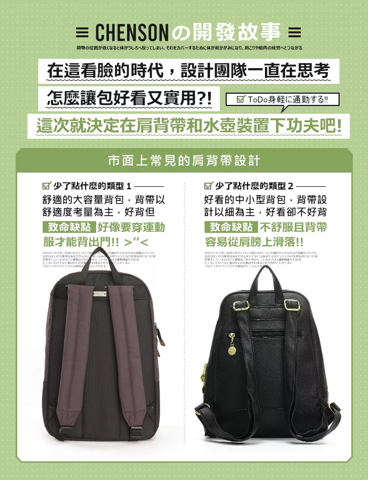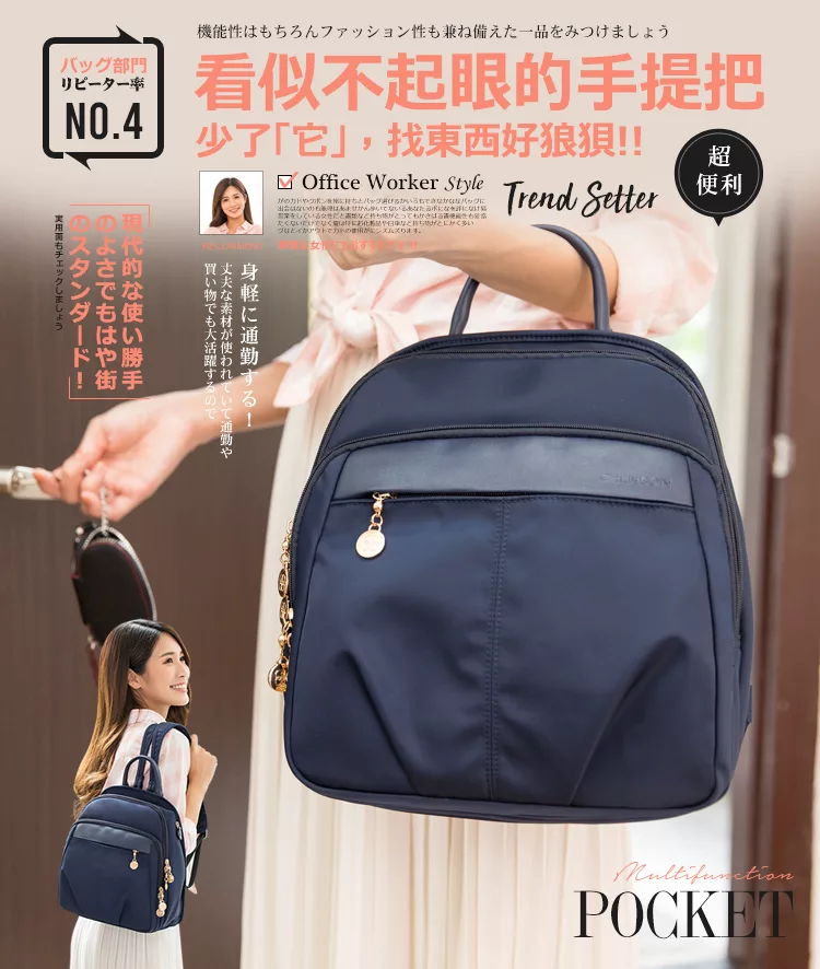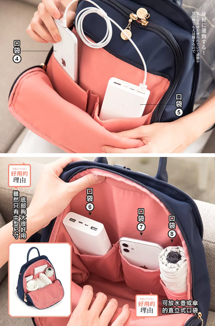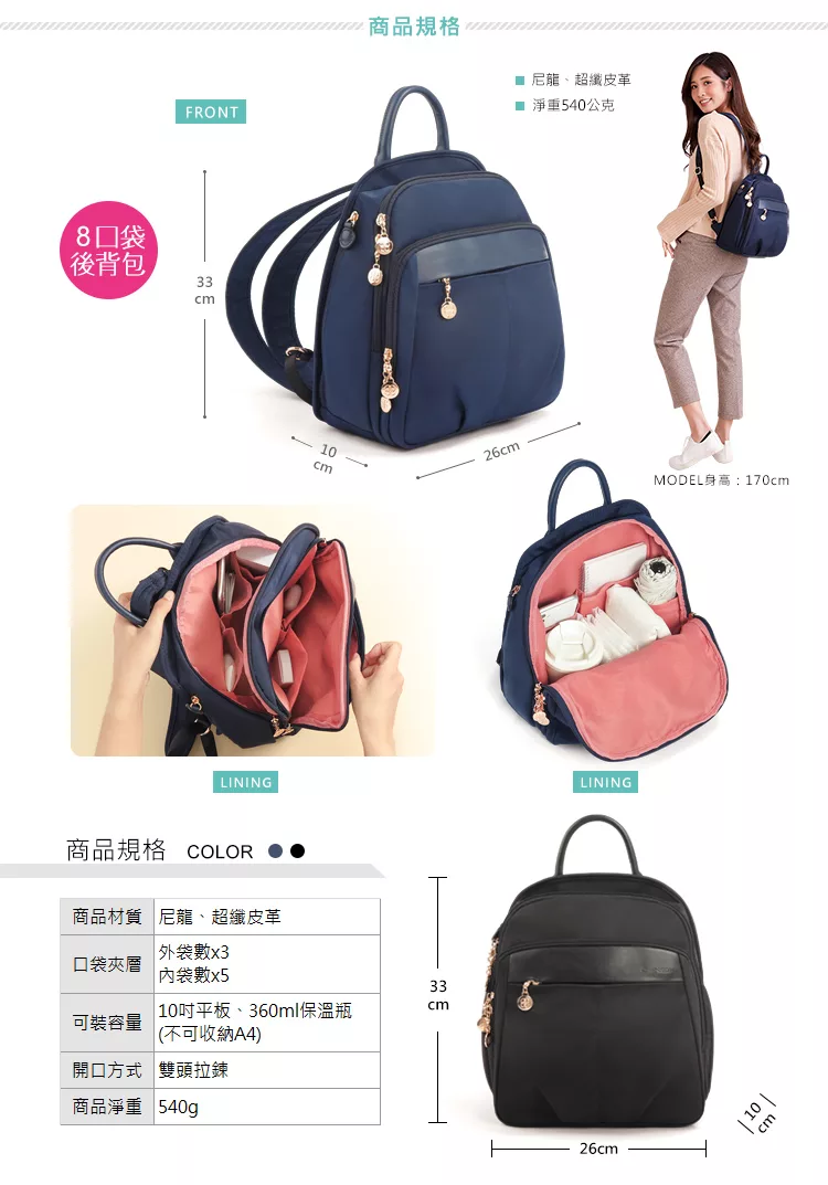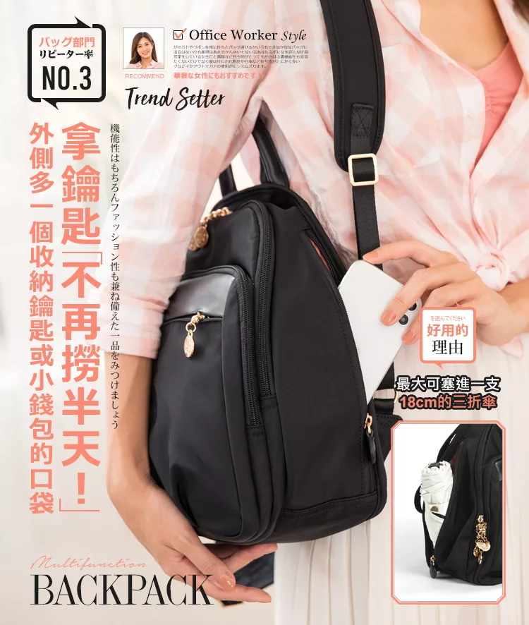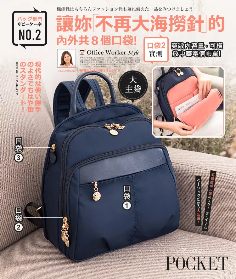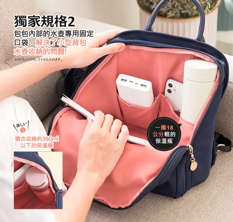 快速到貨-出門不累贅的中型尺寸;同級品牌獨家採用Y字型背帶;由細到寬的背帶,不易滑肩;包包內裡有水壺固定口袋;不再大海撈針內外8口袋;多了手提把,找東西不狼狽。
