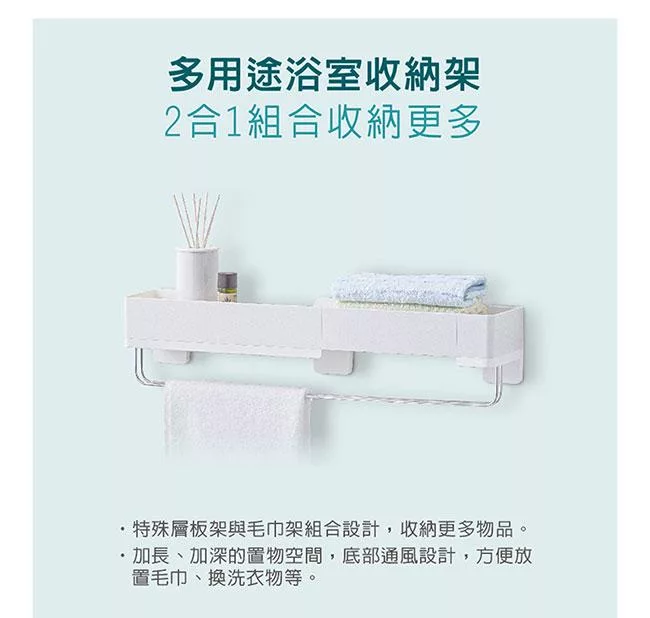 ◆獨特設計,層板架與毛巾架組合,收納更多毛巾與物品。