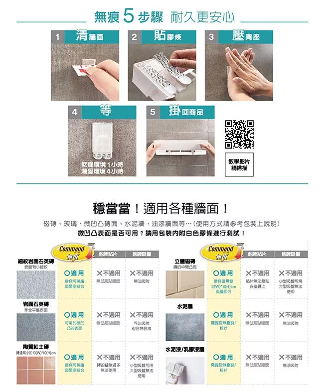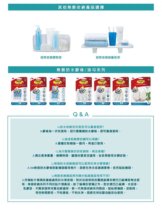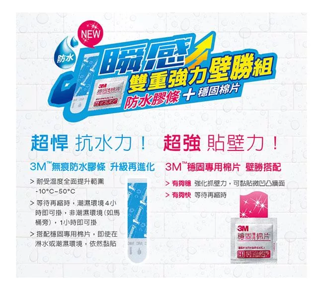 ◆使用3M獨家無痕防水膠條,全新強力膠層,抗水氣、超防水。搭配穩固專用棉片,等待時間縮短,即使在淋水或潮濕環境,依然黏貼穩固。