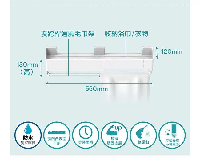 ◆下方特殊雙跨桿通風設計的毛巾架,讓毛巾更通風易乾。整齊收納,增加浴室使用空間。