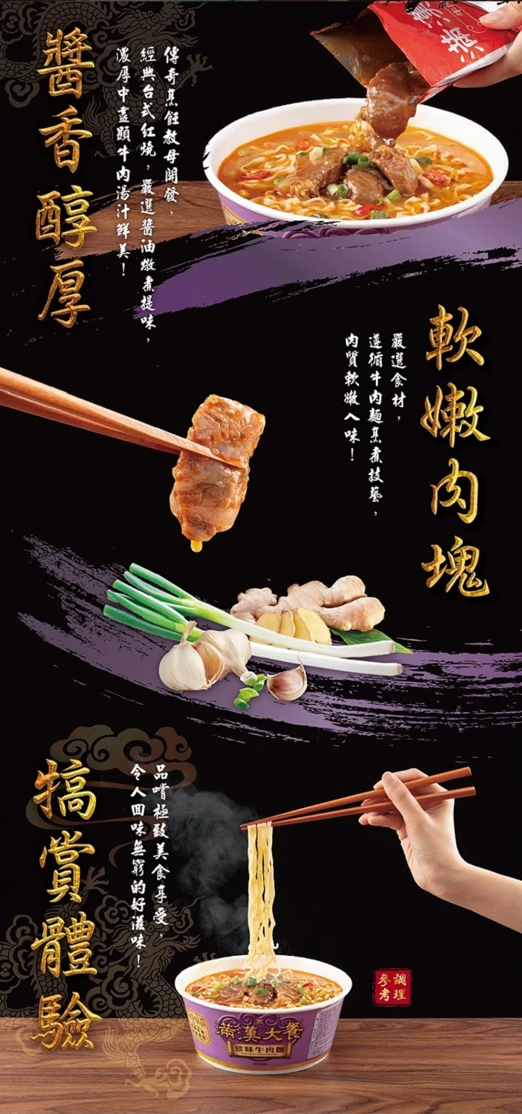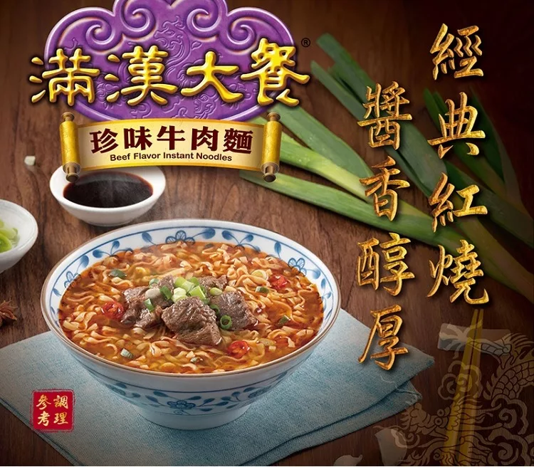 滿漢大餐承襲華人宮廷料理-滿漢全席的精髓,以塑造消費者心中最具代表性的豪華即食麵為願景,持續鑽研當代最佳製麵工藝,