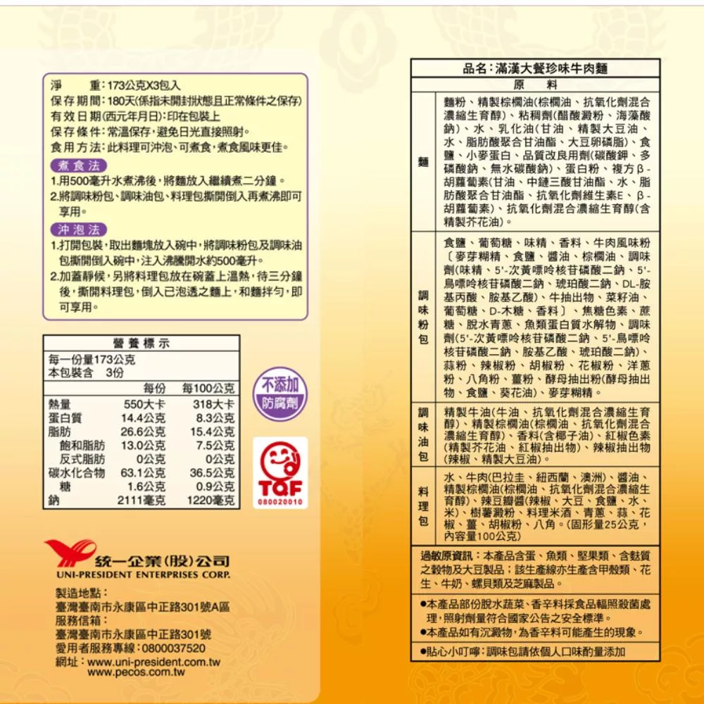 調味粉包:食鹽、葡萄糖、味精、香料、牛肉風味粉〔麥芽糊精、食鹽、醬油、棕櫚油、調味劑(味精、5'-次黃嘌呤核苷磷酸二鈉、5'-鳥嘌呤核苷磷酸二鈉、琥珀酸二鈉、DL-胺基丙酸、胺基乙酸)、牛抽出物、菜籽油、葡萄糖、D-木糖、香料〕、焦糖色素、蔗糖、脫水青蔥、魚類蛋白質水解物、調味劑(5'-次黃嘌呤核苷磷酸二鈉、5'-鳥嘌呤核苷磷酸二鈉、胺基乙酸、琥珀酸二鈉)、蒜粉、辣椒粉、胡椒粉、花椒粉、洋蔥粉、八角粉、薑粉、酵母抽出粉(酵母抽出物、食鹽、葵花油)、麥芽糊精。