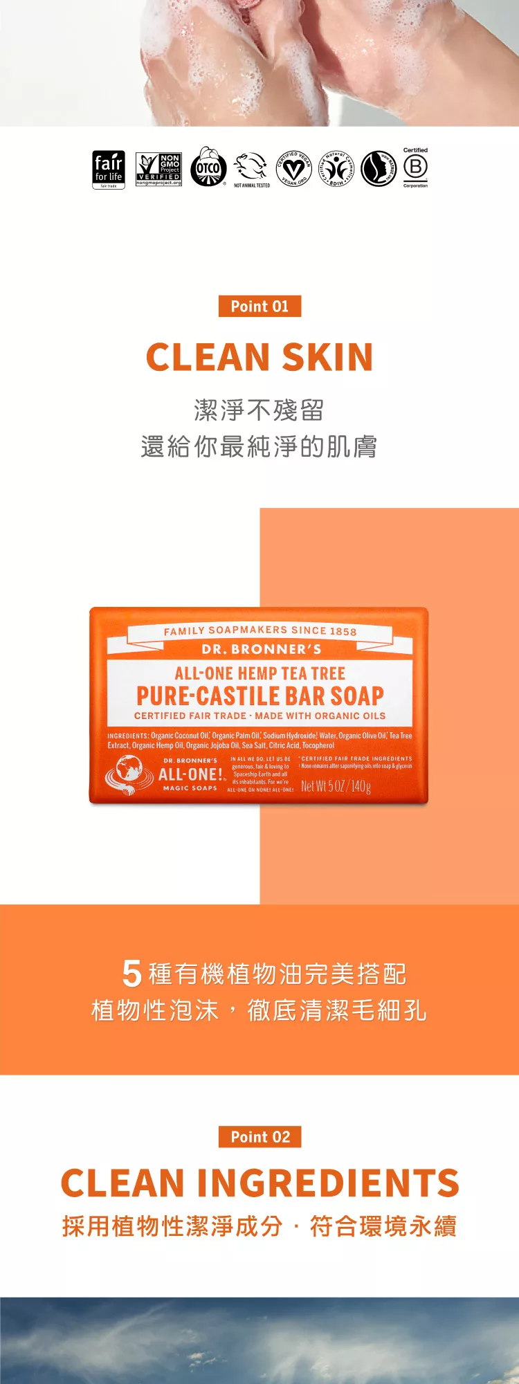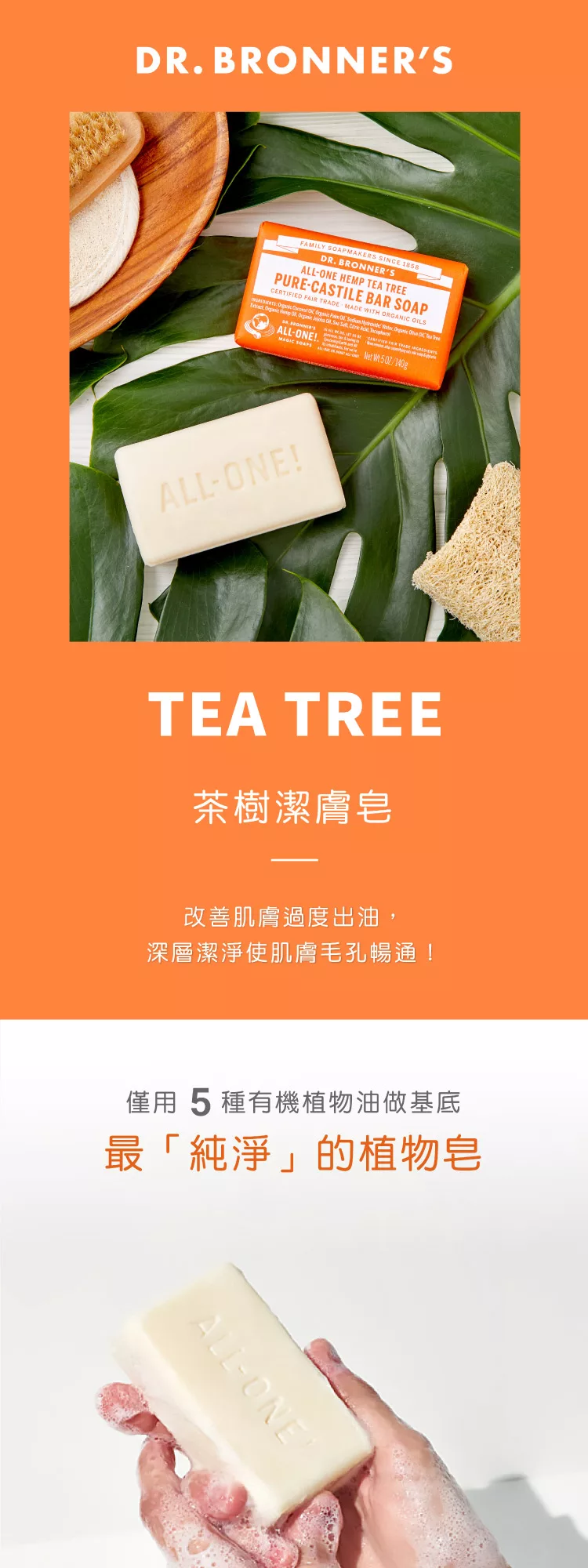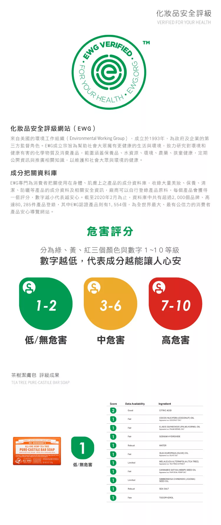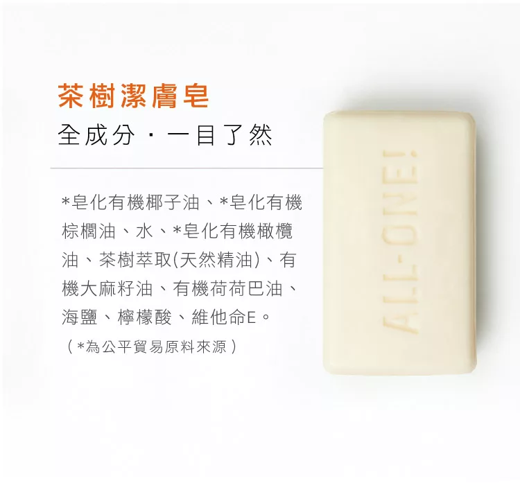 *皂化有機椰子油、*皂化有機棕櫚油、水、*皂化有機橄欖油、茶樹萃取(天然精油)、有機大麻籽油、有機荷荷巴油、海鹽、檸檬酸、維他命E。*為公平貿易原料來源。