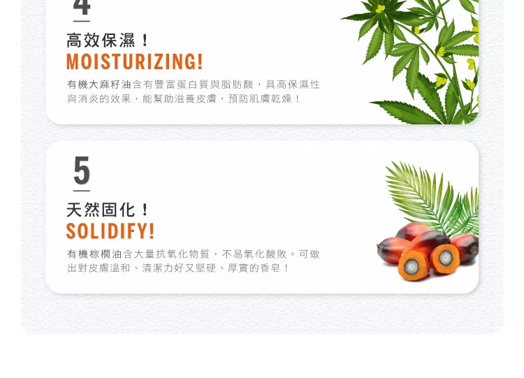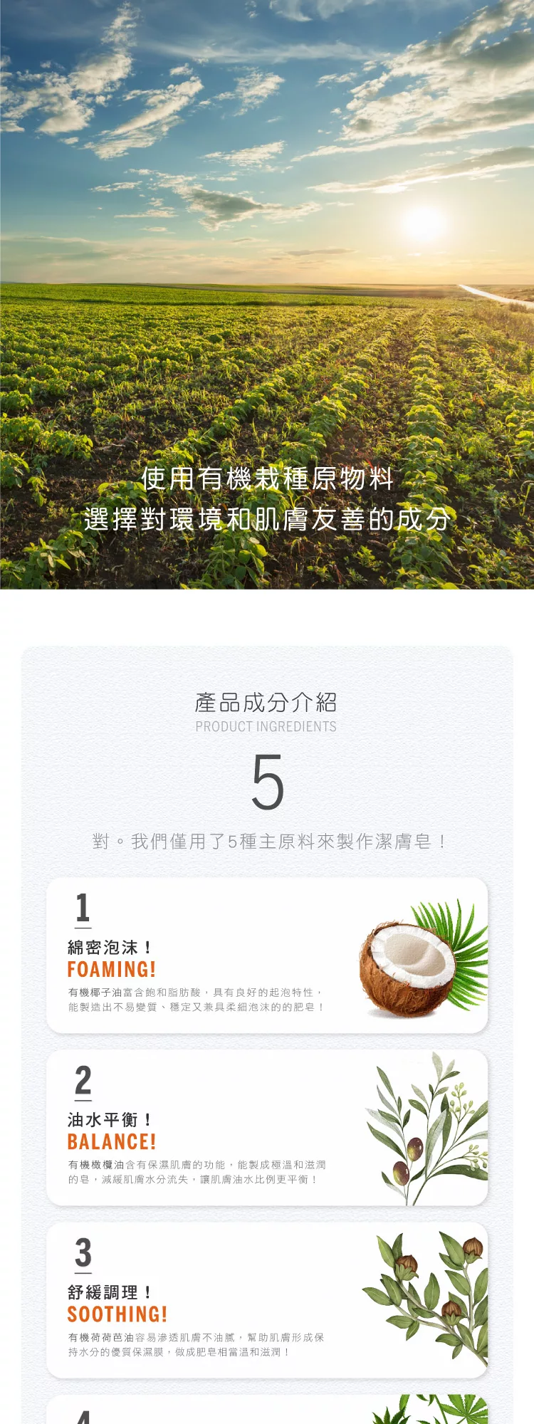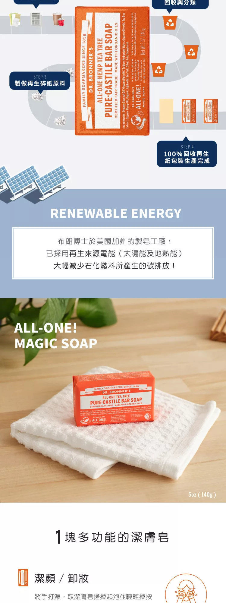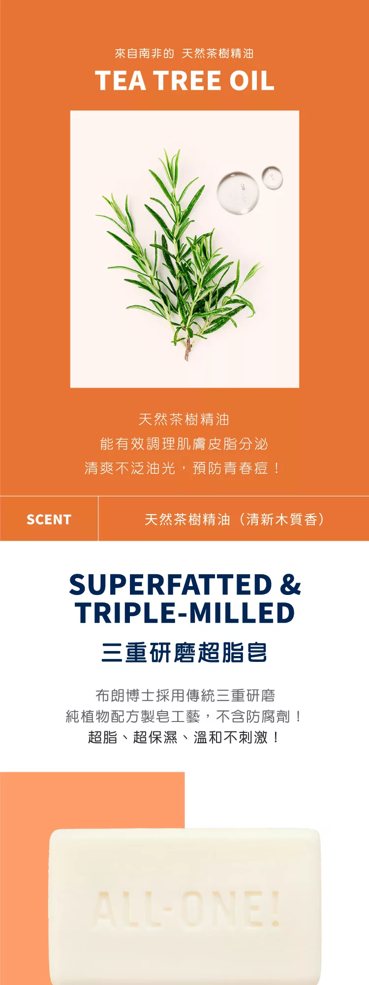 *皂化有機椰子油、*皂化有機棕櫚油、水、*皂化有機橄欖油、茶樹萃取(天然精油)、有機大麻籽油、有機荷荷巴油、海鹽、檸檬酸、維他命E。*為公平貿易原料來源。