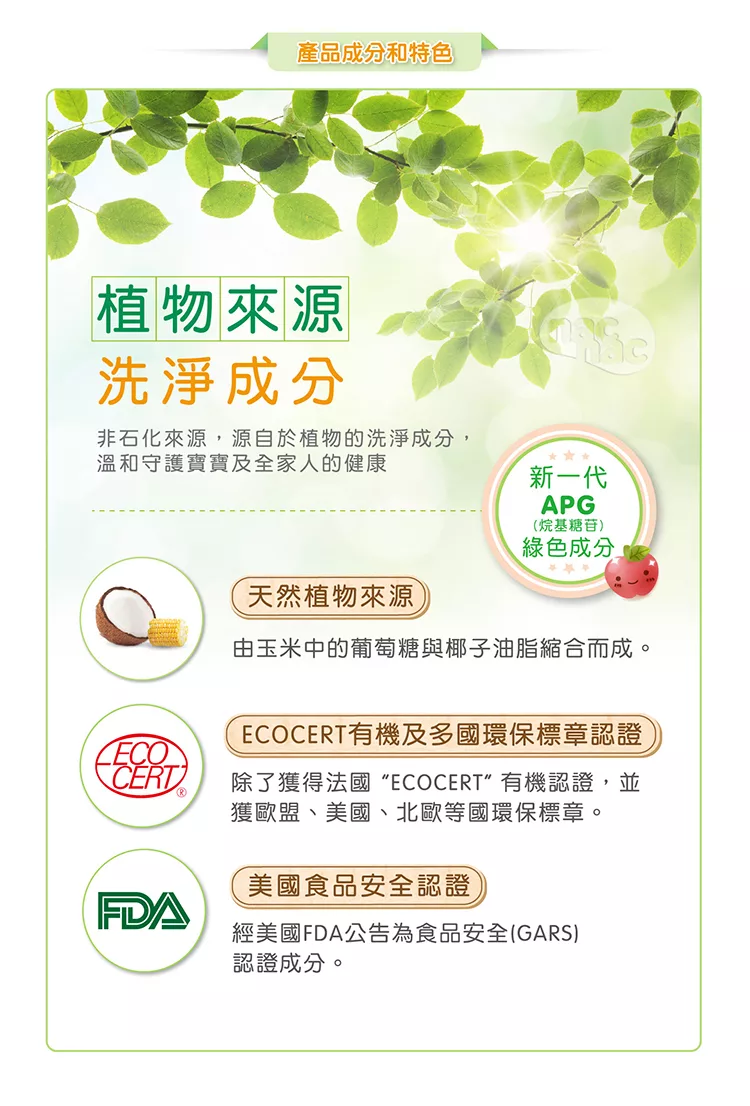 採用新一代綠色環保成分「APG」(烷基糖?),由玉米中的葡萄糖與椰子油脂肪醇縮合而成,