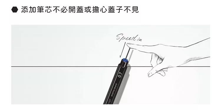 後方按壓處設有筆芯放入孔,添加筆芯不必開蓋或擔心蓋子不見。