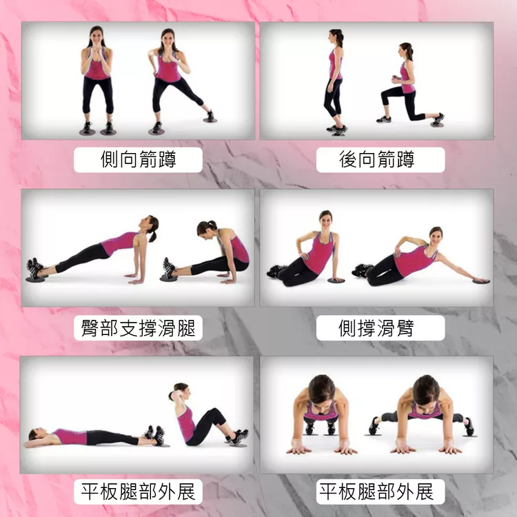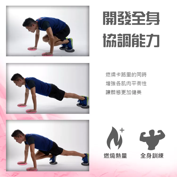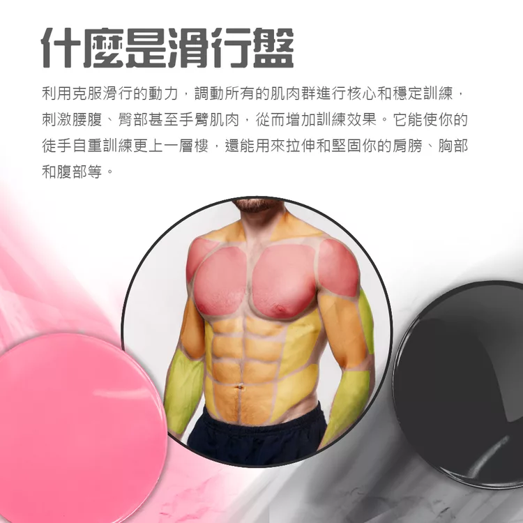 健身運動滑行盤/健力盤/滑力盤: 利用克服滑行的動力,調動所有肌肉群進行的核心和穩定訓練,進而刺激腰腹 及臀部肌肉,增加訓練效果。它能使你的徒手訓練更上一層樓,還能用來拉伸 和堅固你的肩膀、胸部和腹部等。