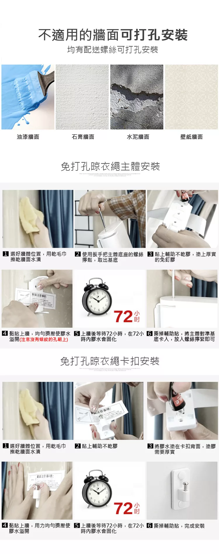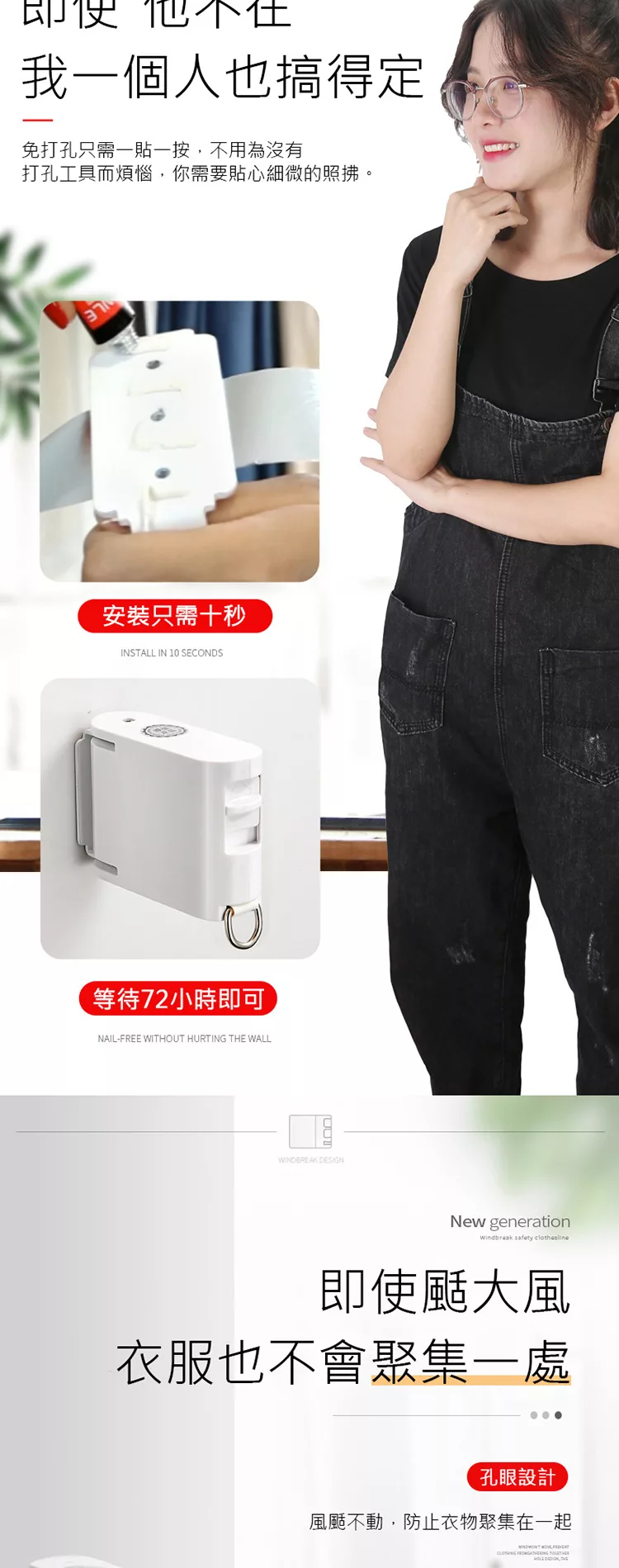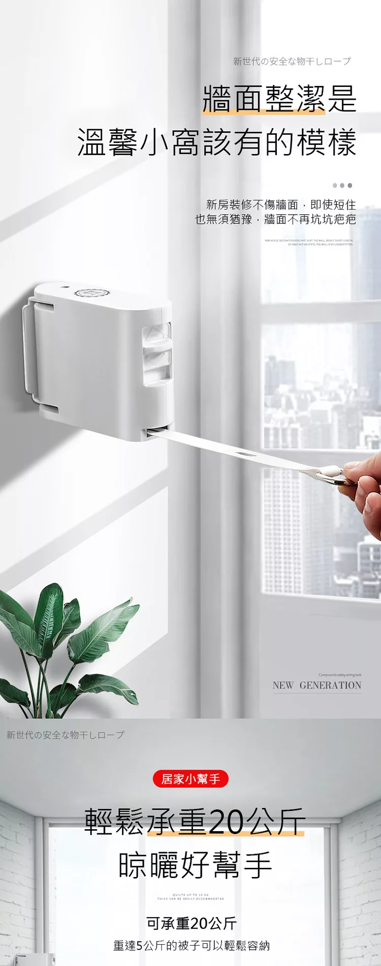 晾曬好幫手 免打孔不傷牆面 免打孔室內陽台曬衣繩