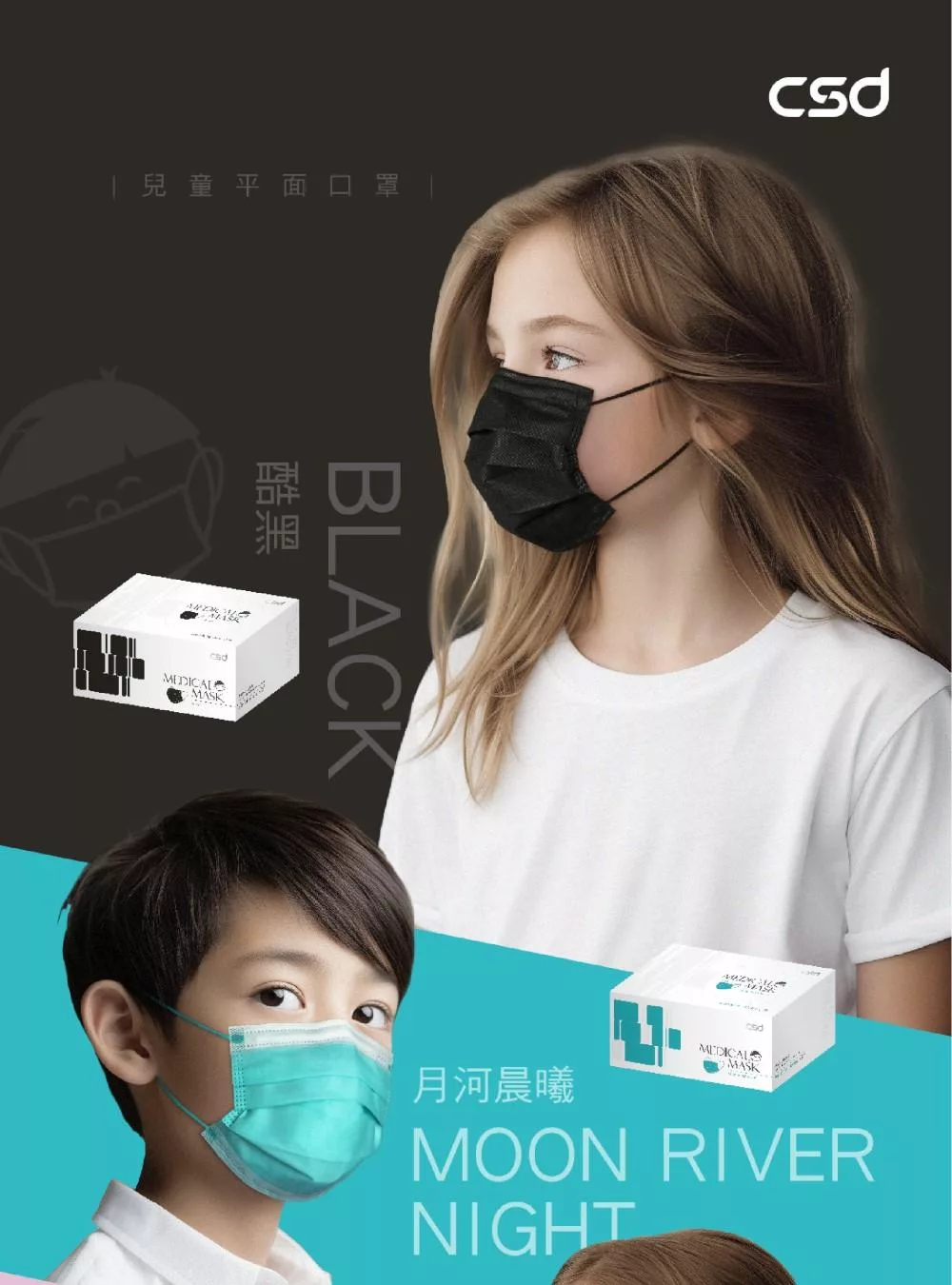 【CSD】中衛醫療口罩-兒童平面-月河藍+炫綠 (30片/盒)