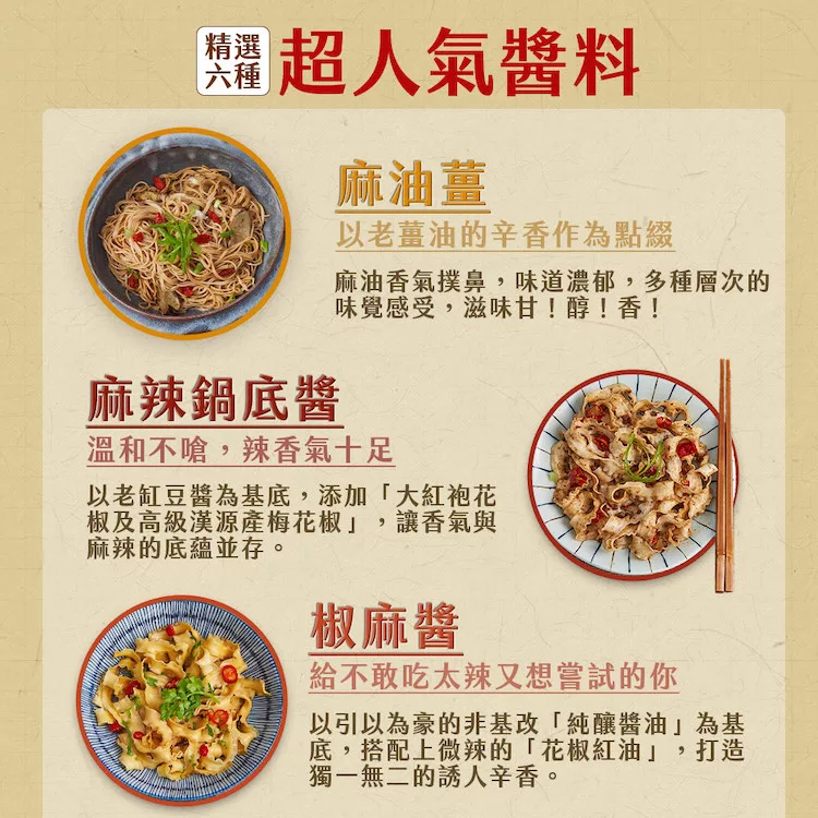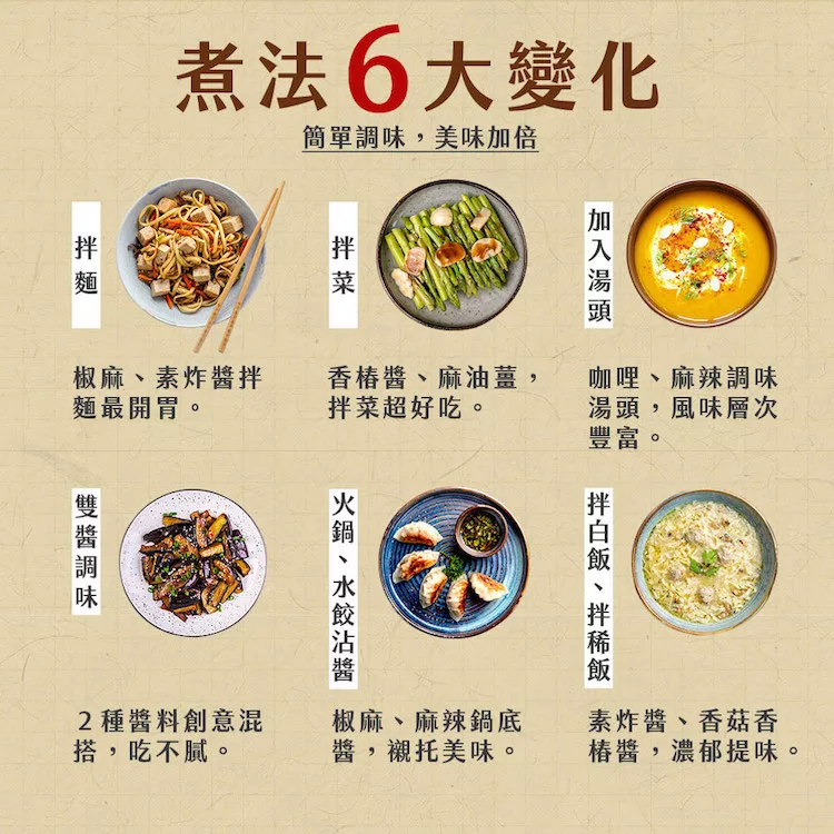 多種口味,百變用途,無論是拌麵、拌菜,或是加入湯裡作為調味都合適,為了無新意的料理找到轉機,伴你輕鬆完成料理,餐桌菜餚不再一成不變!