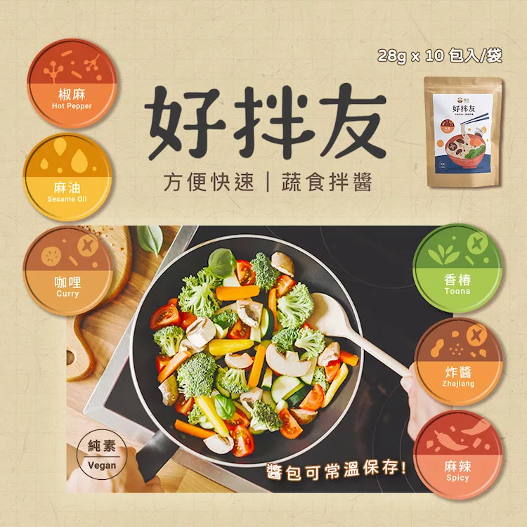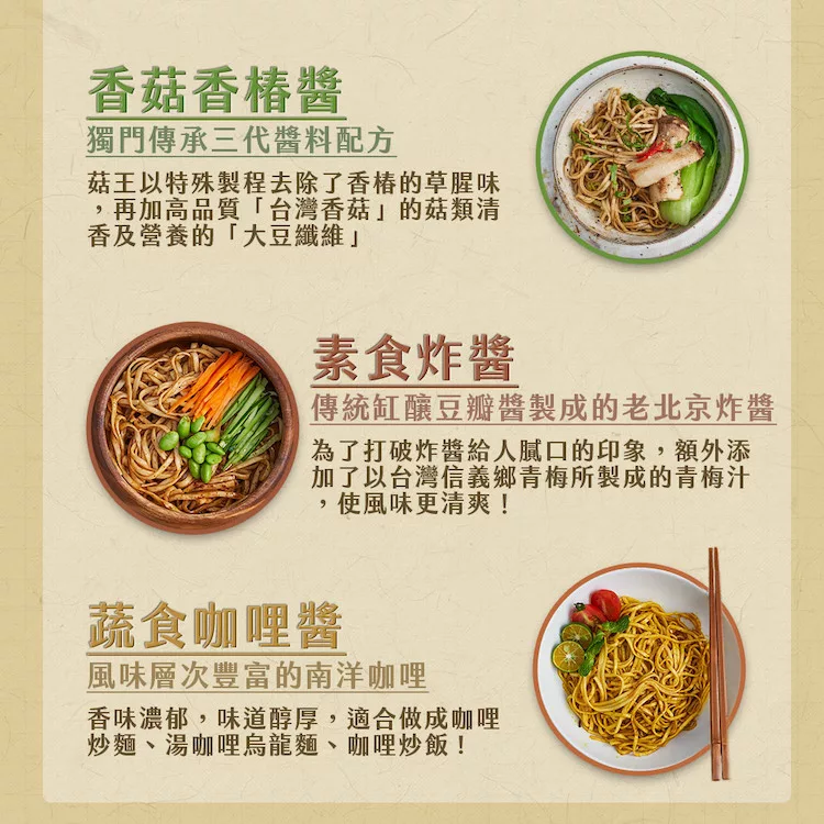 《菇王》以一甲子的素食料理創新研發經驗,打造出一套口味、用途多變的「好拌友」系列。