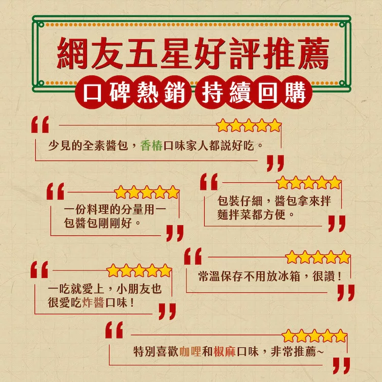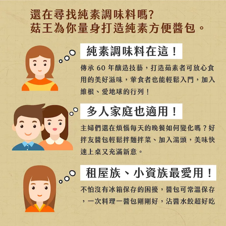 嚴選食材,打造茹素者可放心食用的純素醬料,美好滋味,葷食者也能夠輕鬆入門,加入維根、愛地球的行列!