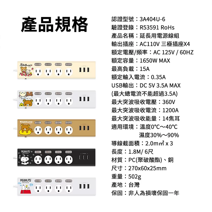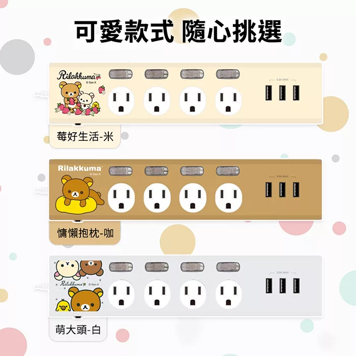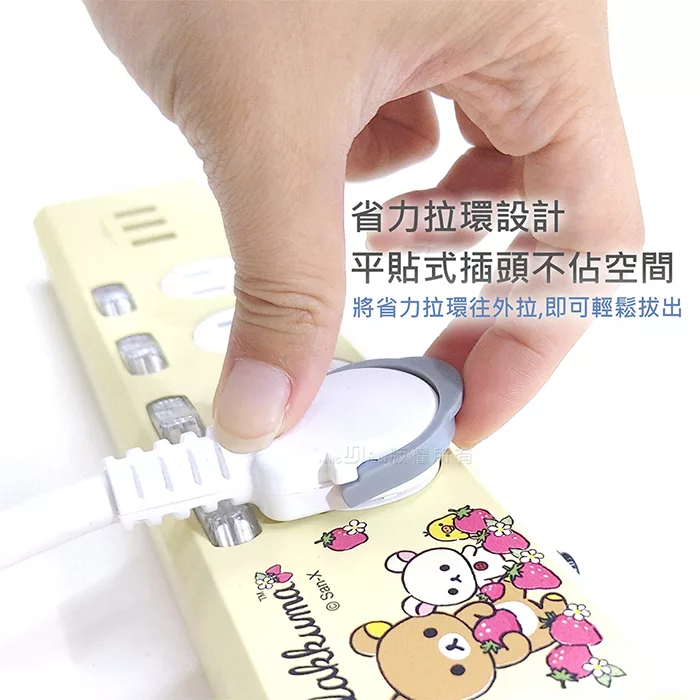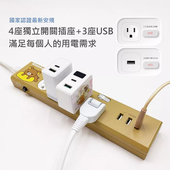 【正版授權】Rilakkuma拉拉熊 3.5A 四開四插3USB延長用電源線/延長線1.8M 萌大頭-白