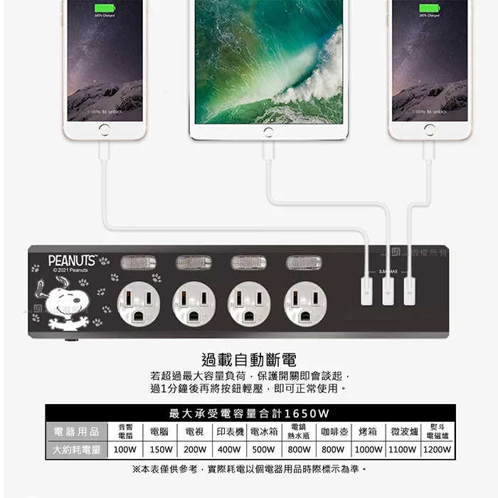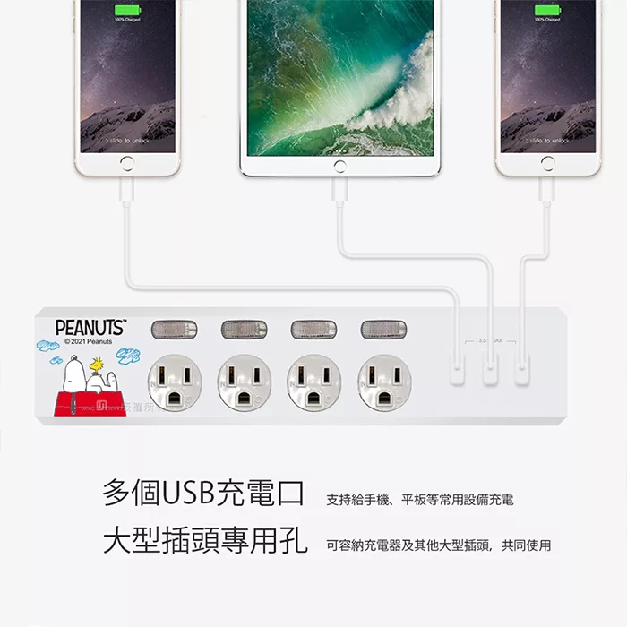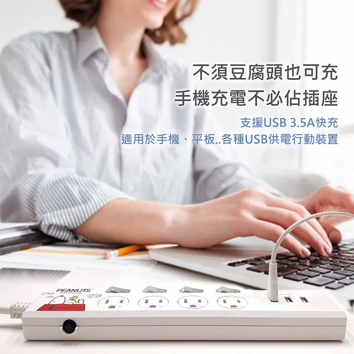 【正版授權】SNOOPY史努比 PD 37W平貼式延長線 按壓式4開3插+USB/Type-C延長線 1.8M 百變生活