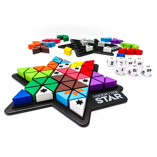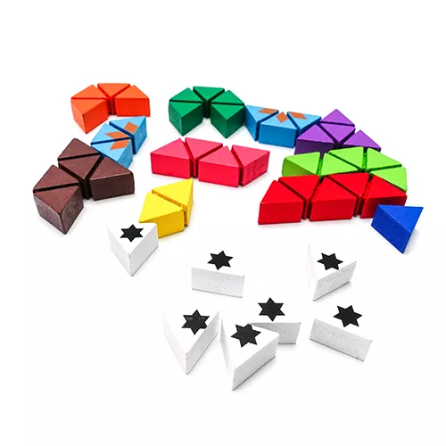 在48個三角形組成的六芒星版圖上,11種積木與7根「柱樁」能變化出165,888種組合。