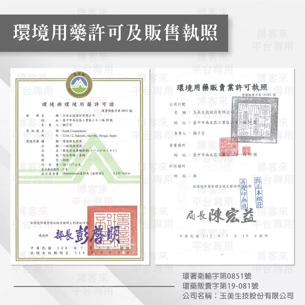 (二)合法環境用藥應有環境用藥許可證字號,可至環保署化學局「環境用藥許可證及病媒防治業網路查詢系統」。