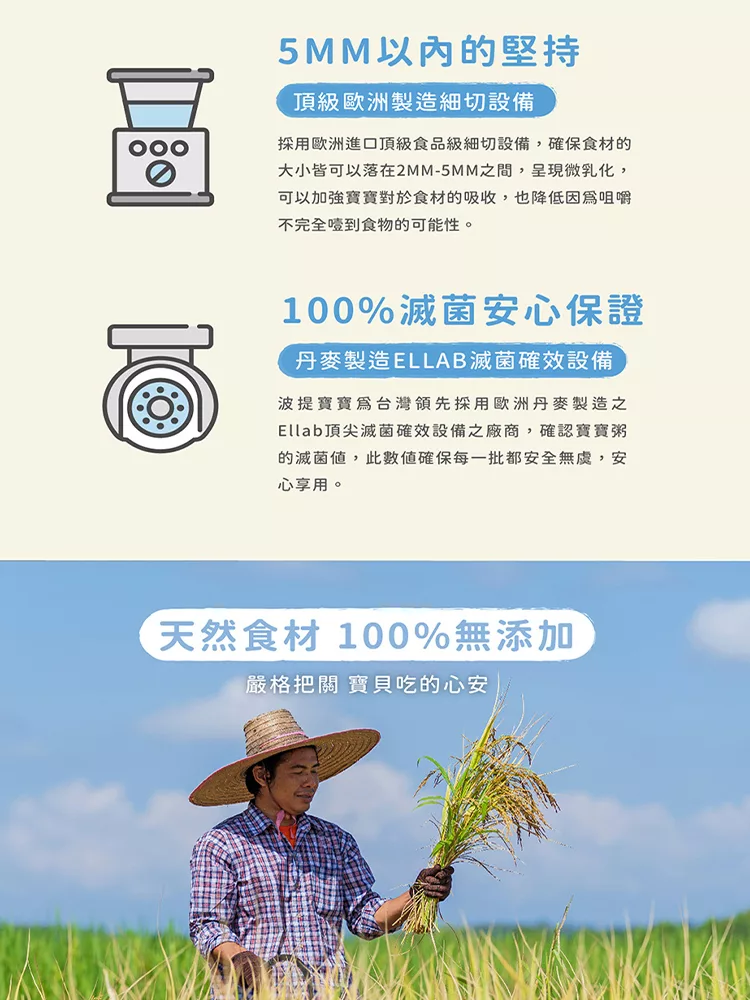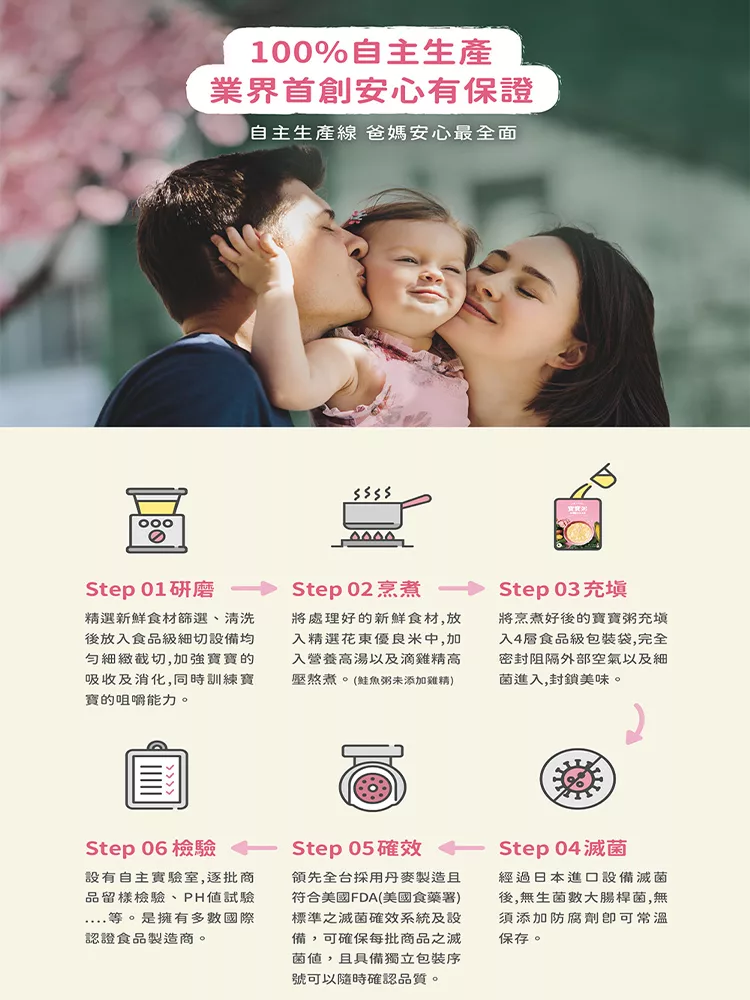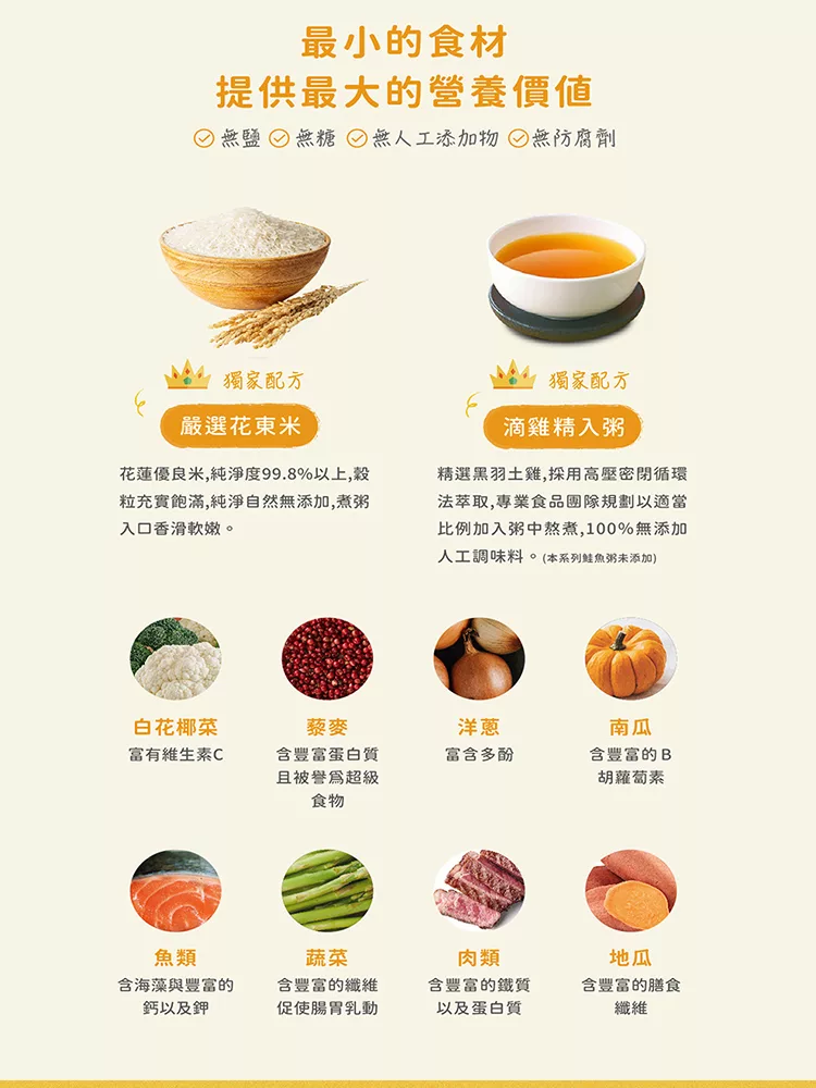 “嚴選CAS認證雞胸肉,紐西蘭進口甜玉米,搭配紅蘿蔔、高麗菜等蔬果,純淨花東優良好米,給與寶寶全面營養,純天然、無添加、藥物殘留未檢出”