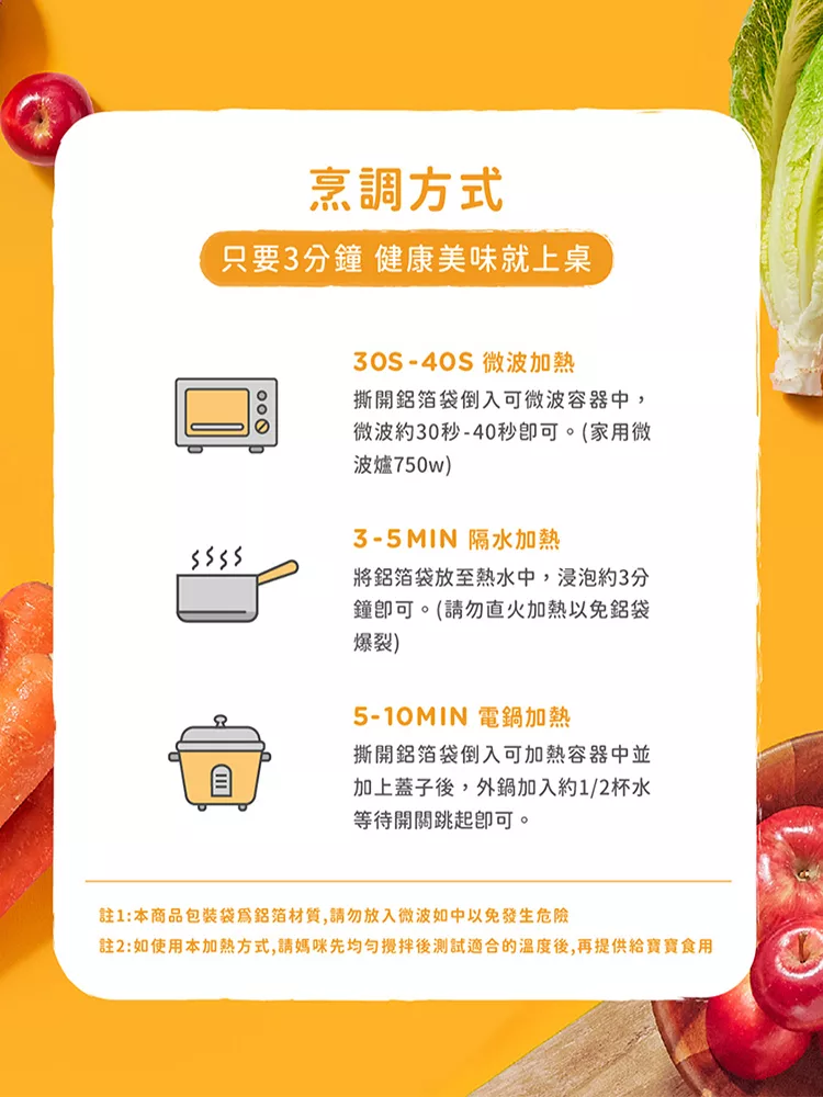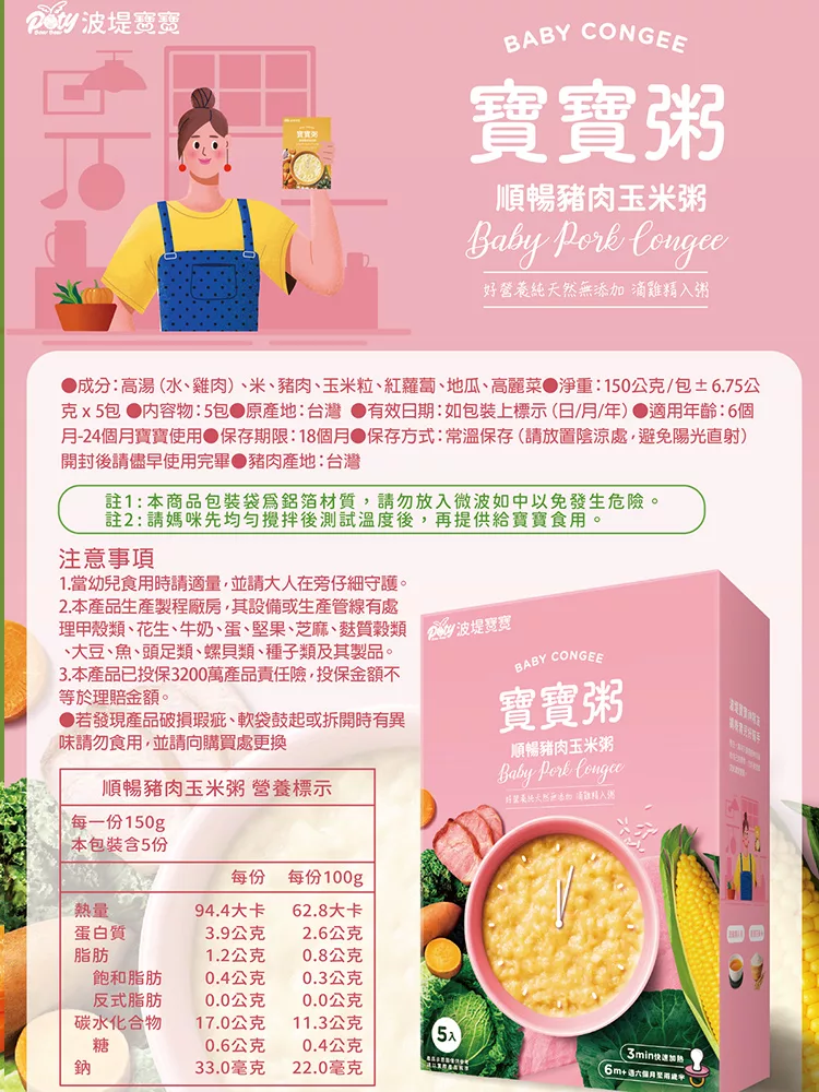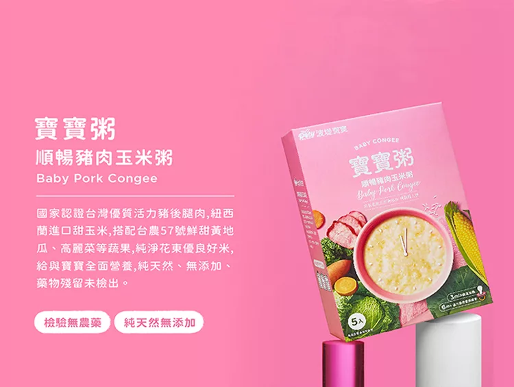 “國家認證台灣優質活力豬後腿肉,紐西蘭進口甜玉米,搭配台農57號鮮甜黃地瓜、高麗菜等蔬果,純淨花東優良好米 ,給與寶寶全面營養,純天然、無添加、藥物殘留未檢出”