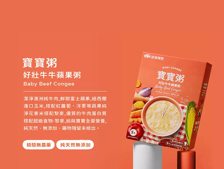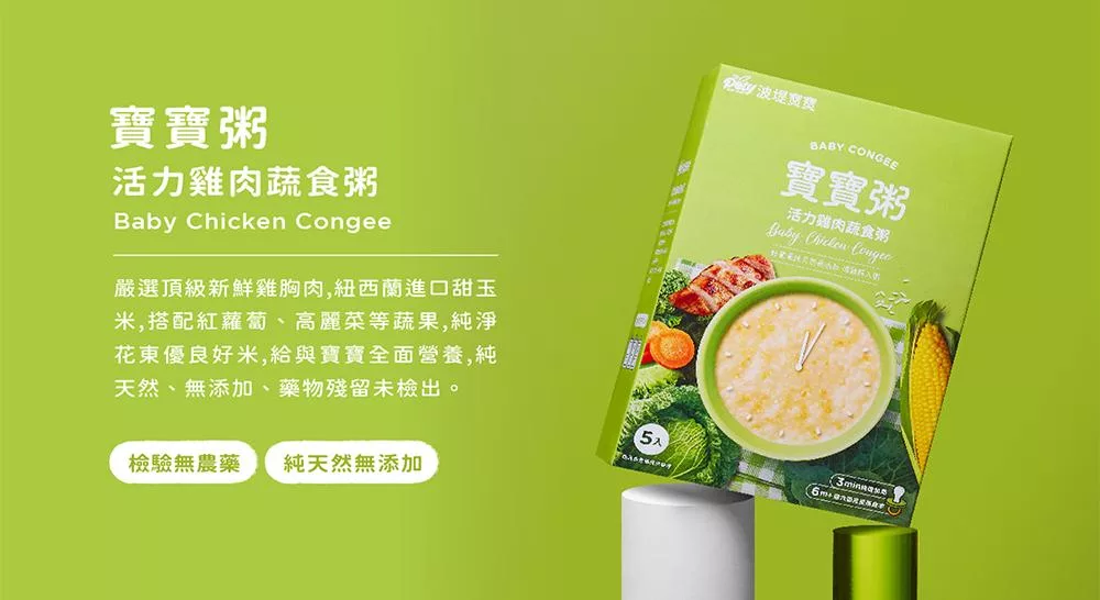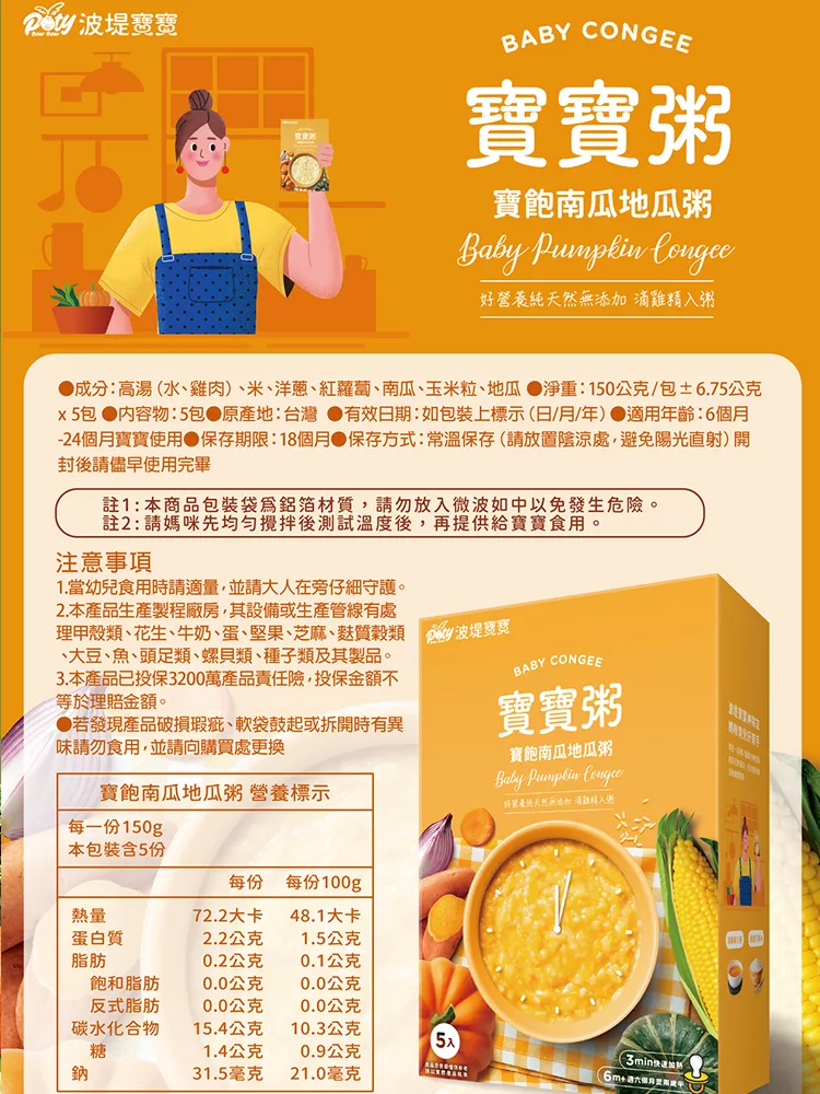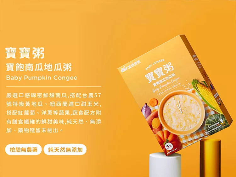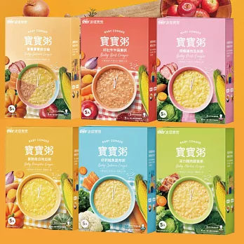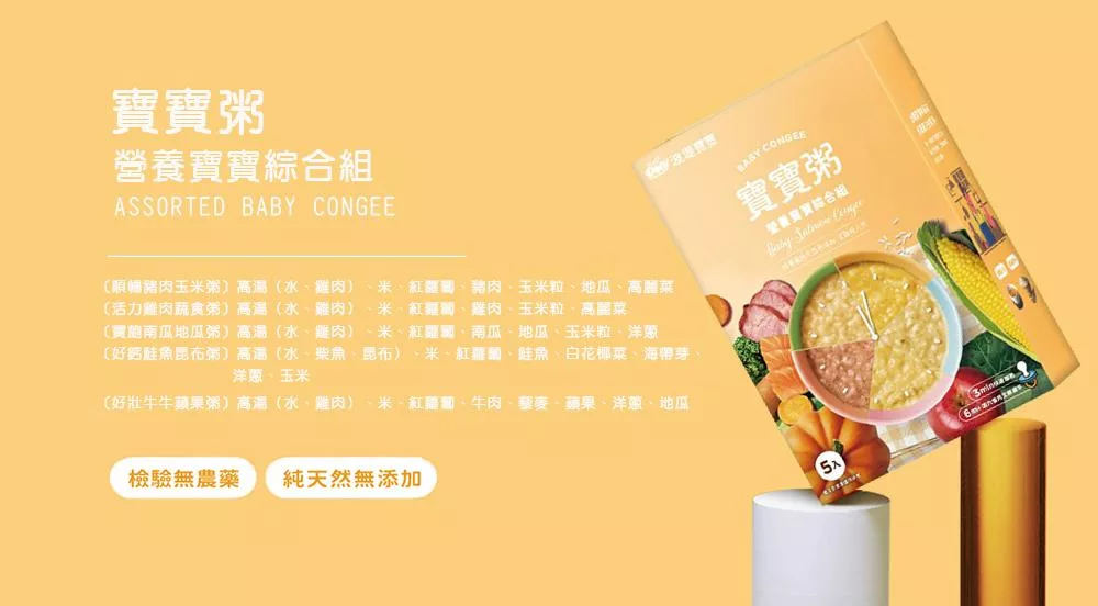 (寶飽南瓜地瓜粥、活力蔬食雞肉粥、好鈣鮭魚昆布粥、好壯牛牛蘋果粥、順暢豬肉玉米粥)