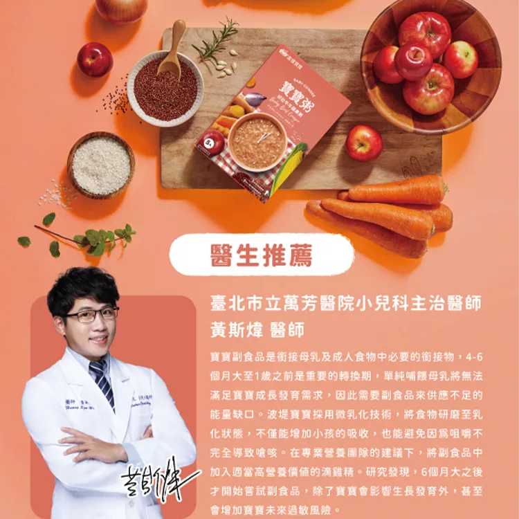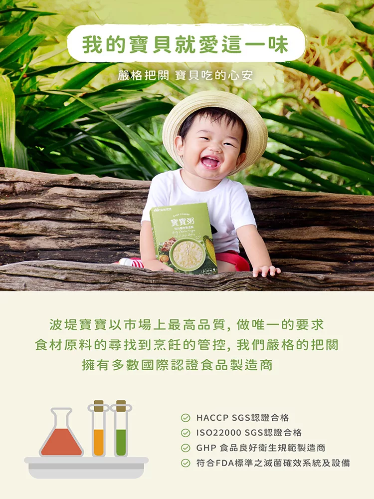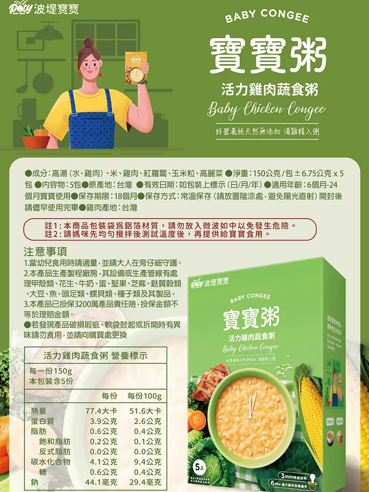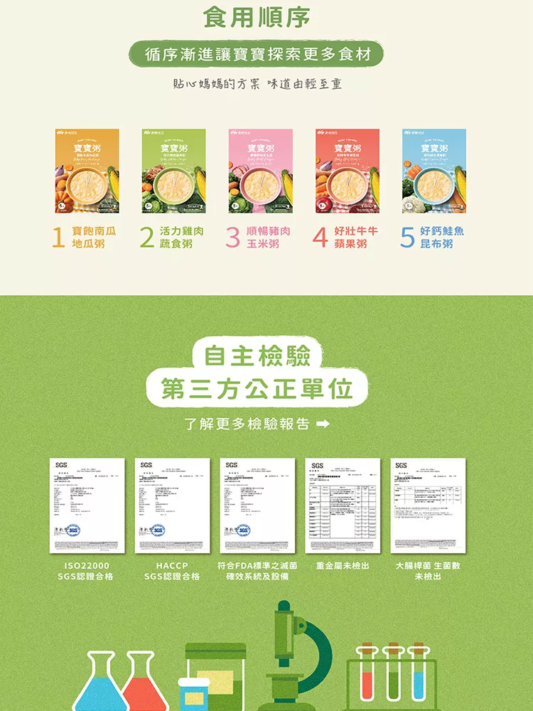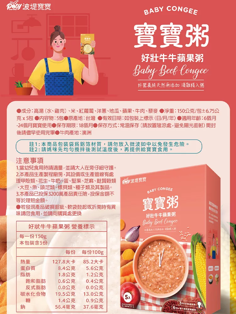 (寶飽南瓜地瓜粥、活力蔬食雞肉粥、好鈣鮭魚昆布粥、好壯牛牛蘋果粥、順暢豬肉玉米粥)