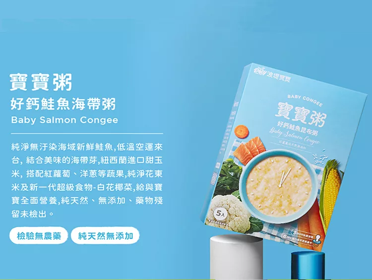 “純淨無汙染海域新鮮鮭魚,低溫空運來台, 結合美味的海帶芽,紐西蘭進口甜玉米, 搭配紅蘿蔔、洋蔥等蔬果,純淨花東米及白花椰菜,給與寶寶全面營養,純天然、無添加、藥物殘留未檢出”