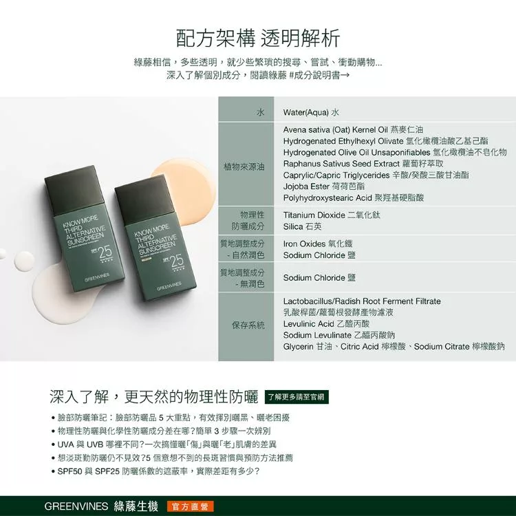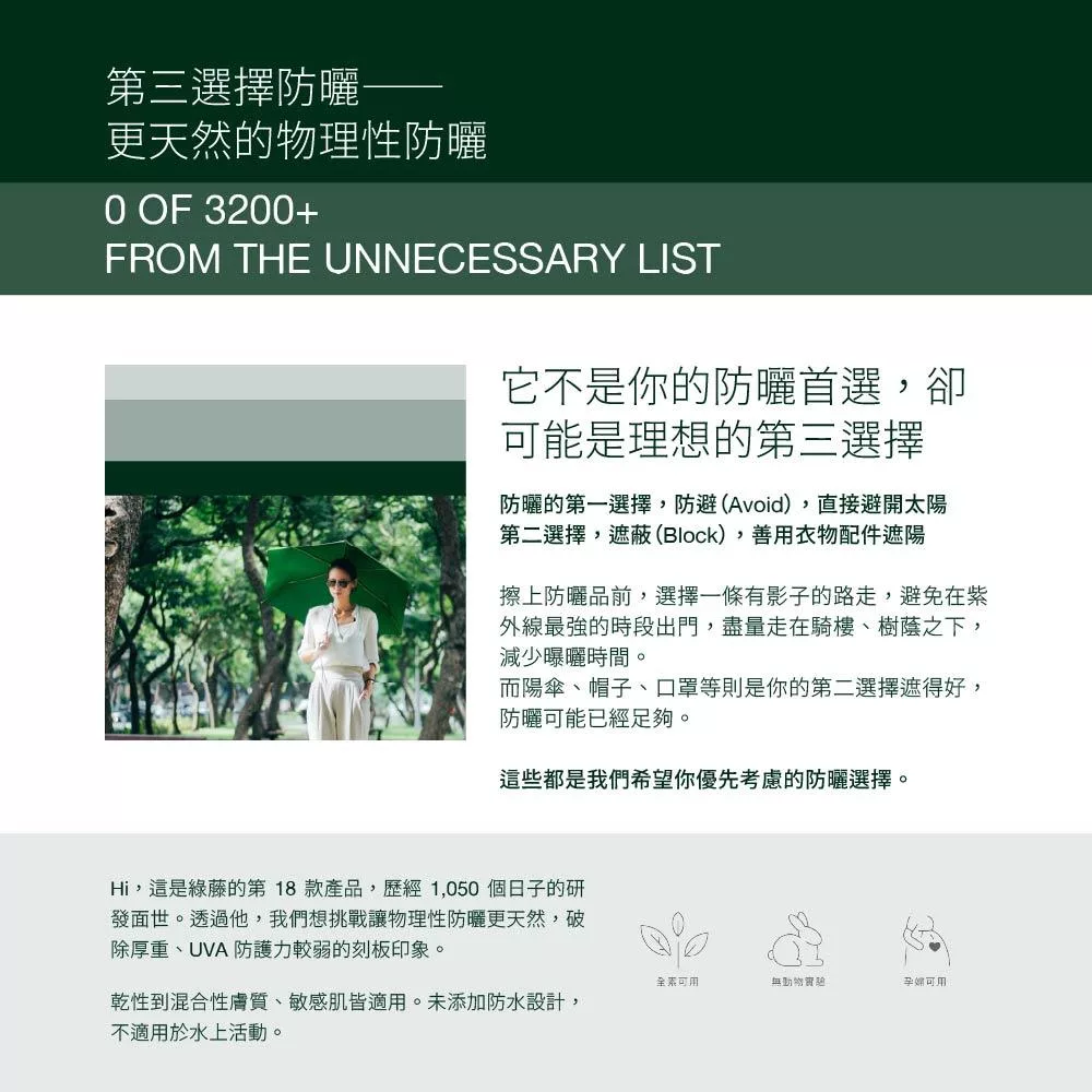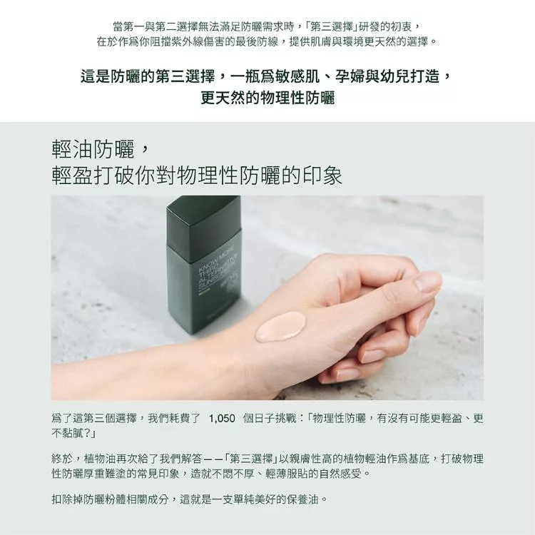 以輕油基底承載非奈米二氧化鈦,為敏感肌打造更天然的物理性防曬,多些更完整的寬頻防護,少些敏感不適與遲疑。深入了解防曬的三個選擇,揮別防曬與環境永續的兩難。
