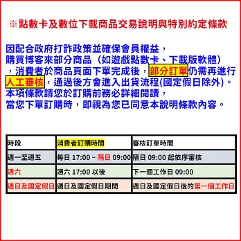 ※ 溫馨提醒:購買博客來部分商品如遊戲點數卡、下載版軟體,博客來保留核單及審單權利,待博客來審核通過方會進入出貨程序 ※