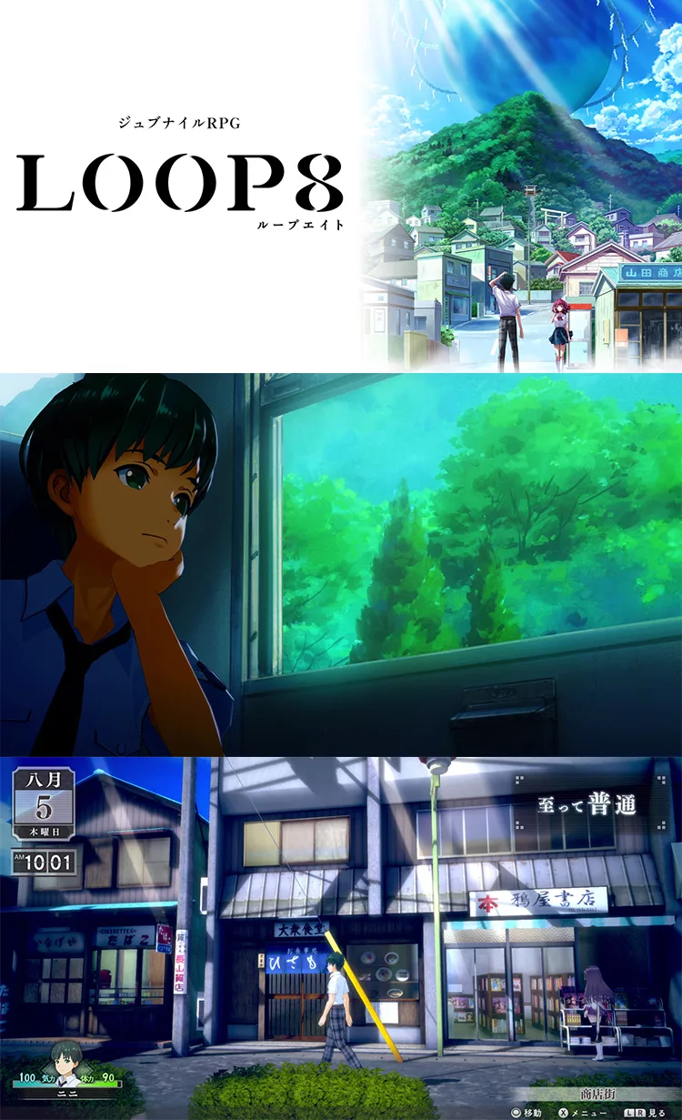 『LOOP8 降神』是一款「青少年RPG」,故事舞台設定在位於日本鄉下的「葦原中鎮」,主角被捲入與威脅人類生存的「化外」間的戰鬥。玩家將在遊戲裡化身主角,與各個登場人物建立人際關係,並度過整個8月。