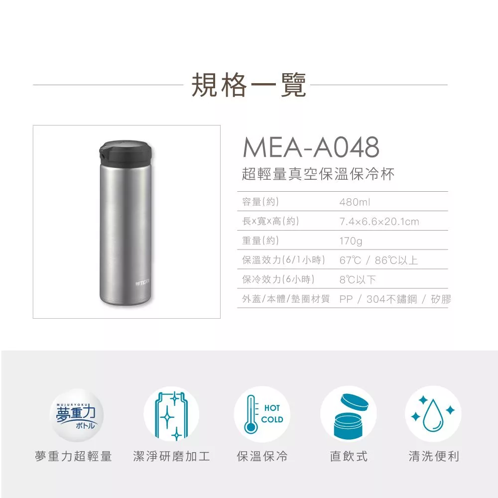 TIGER虎牌 超輕量真空不鏽鋼保溫杯_隨行環保杯480ml(MEA-A048)  不鏽鋼銀
