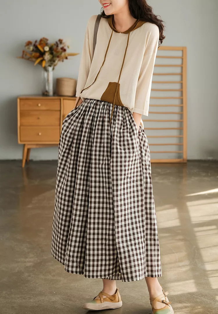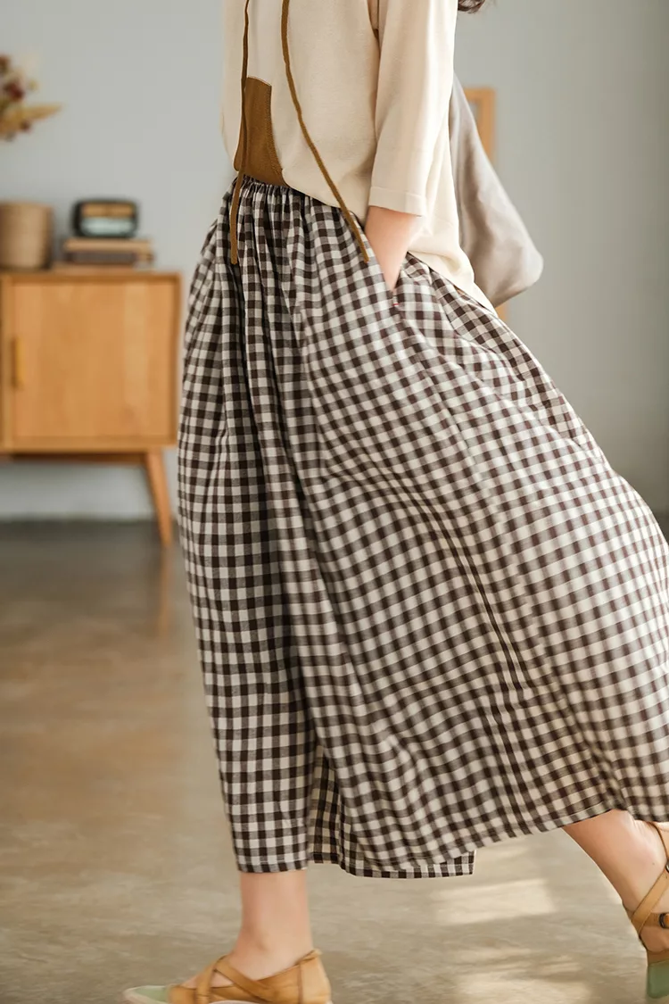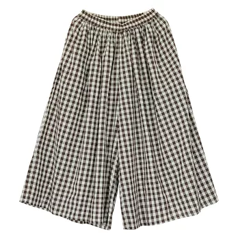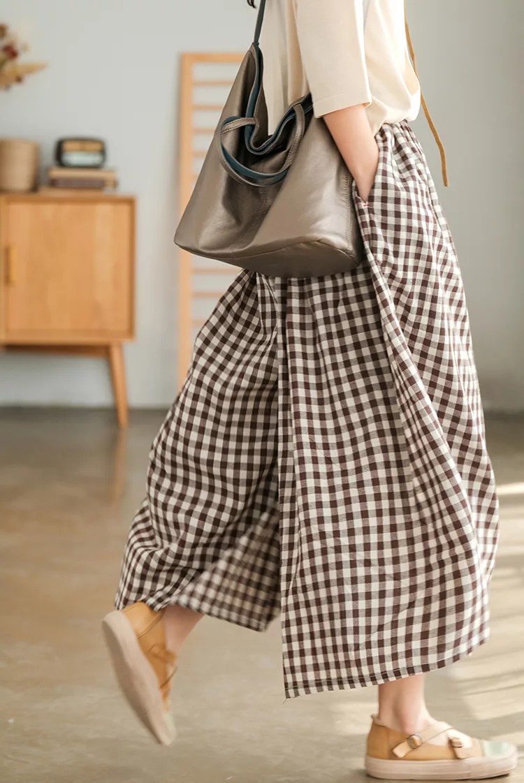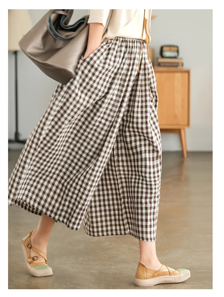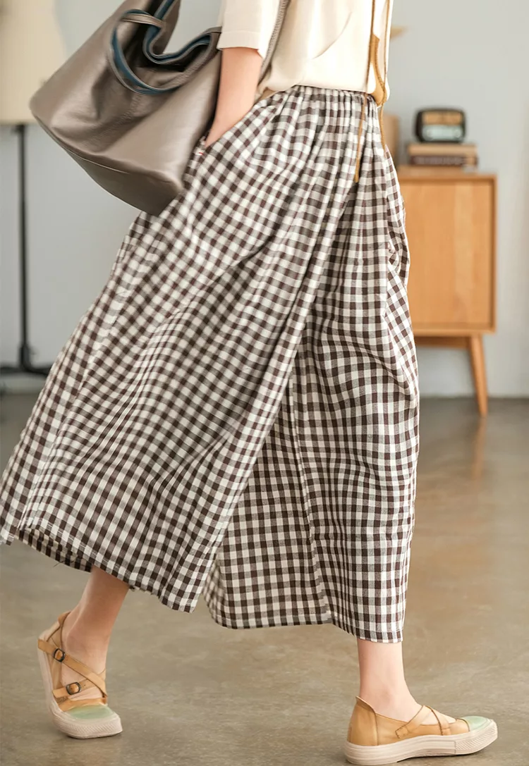 【慢。生活】韓國文藝棉麻風褶皺休閒百搭格子闊腿褲 8027  FREE 咖色