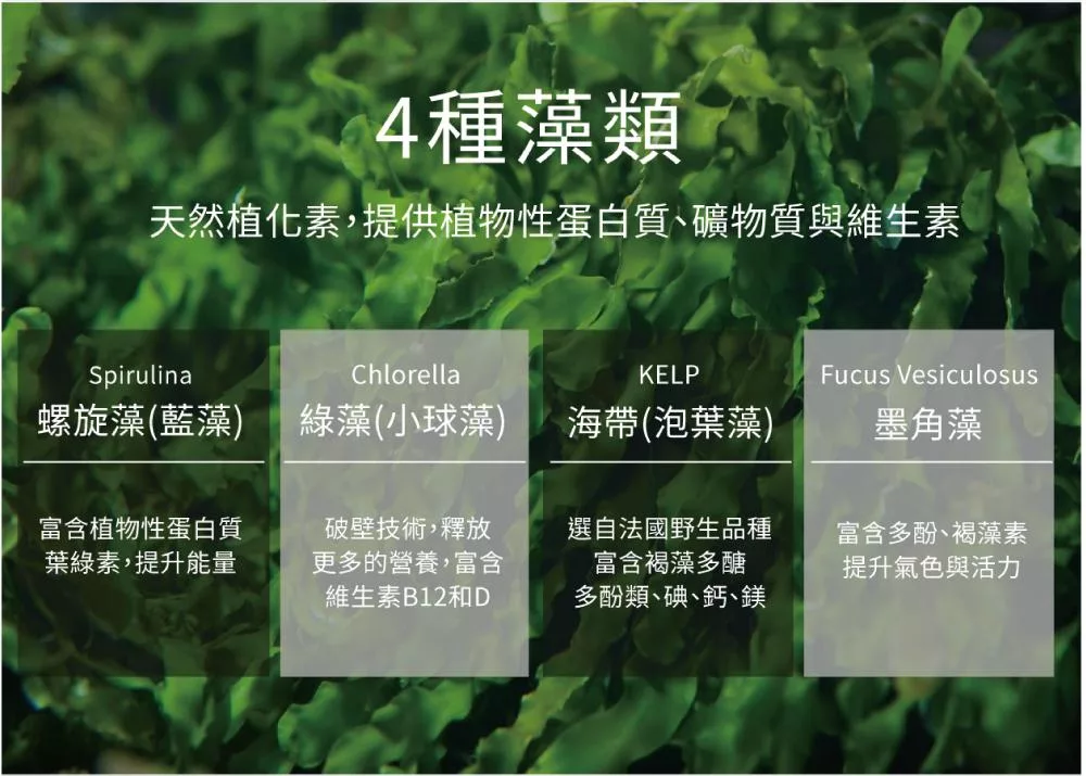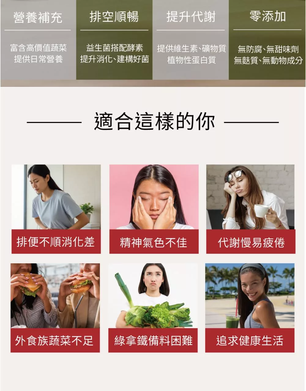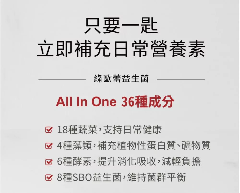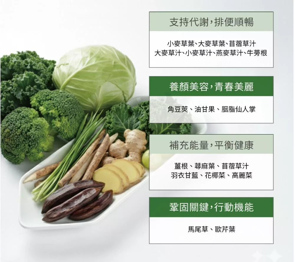 富含18蔬菜、4藻類、6酵素與8益生菌,共36種高營養價值成分,幫助體內循環代謝,調整體質