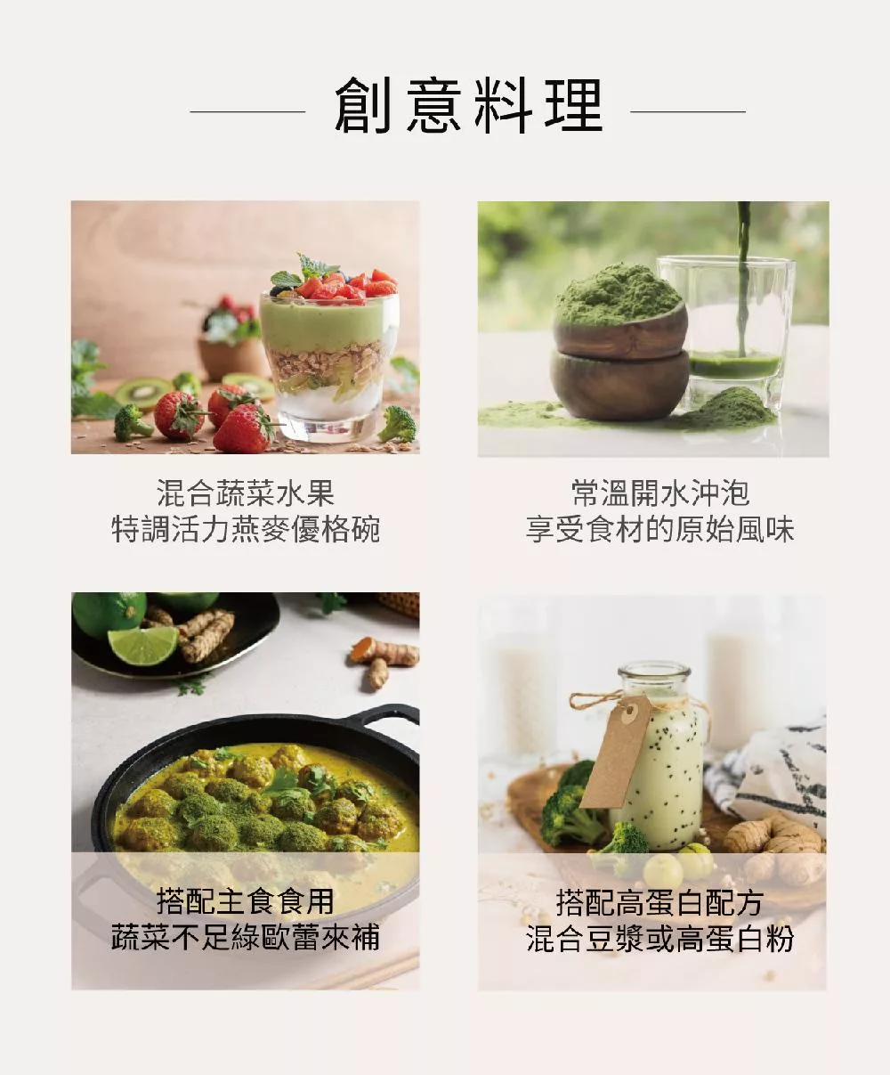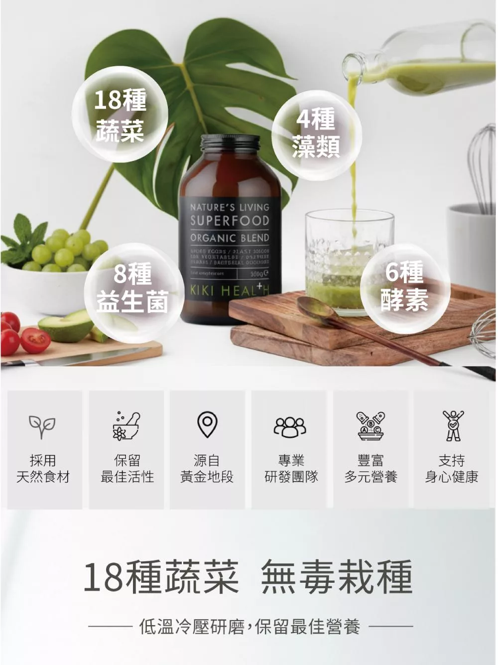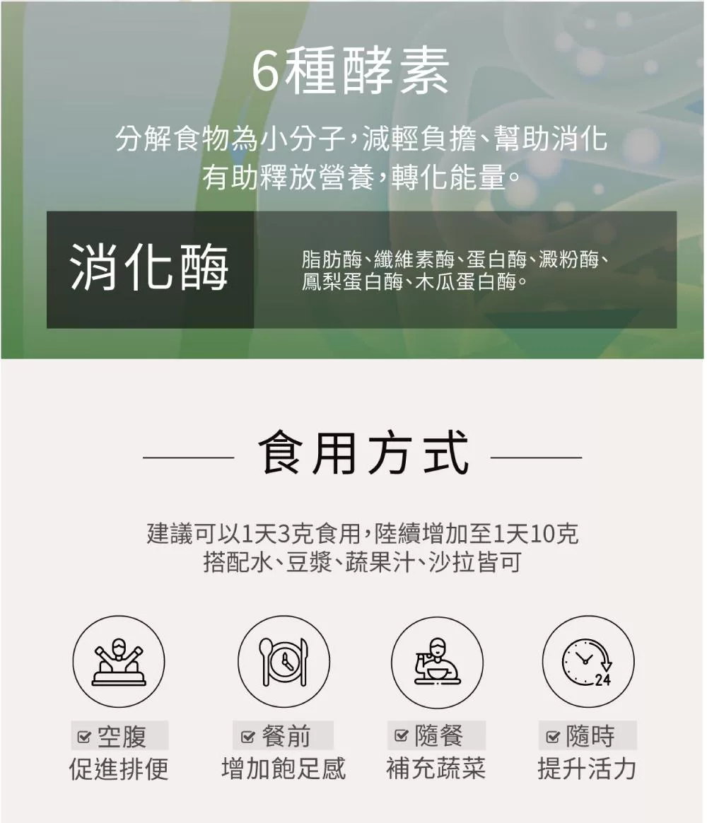 富含18蔬菜、4藻類、6酵素與8益生菌,共36種高營養價值成分,幫助體內循環代謝,調整體質