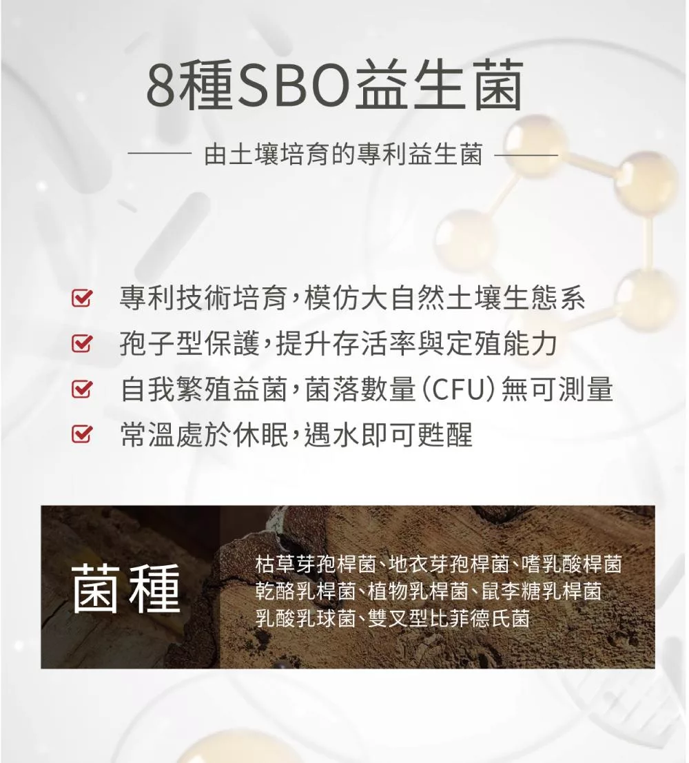 益生菌種:枯草芽孢桿菌、地衣芽孢桿菌、嗜乳酸桿菌、乾酪乳桿菌、植物乳桿菌、鼠李糖乳桿菌、乳酸乳球菌、雙叉型比菲德氏菌。