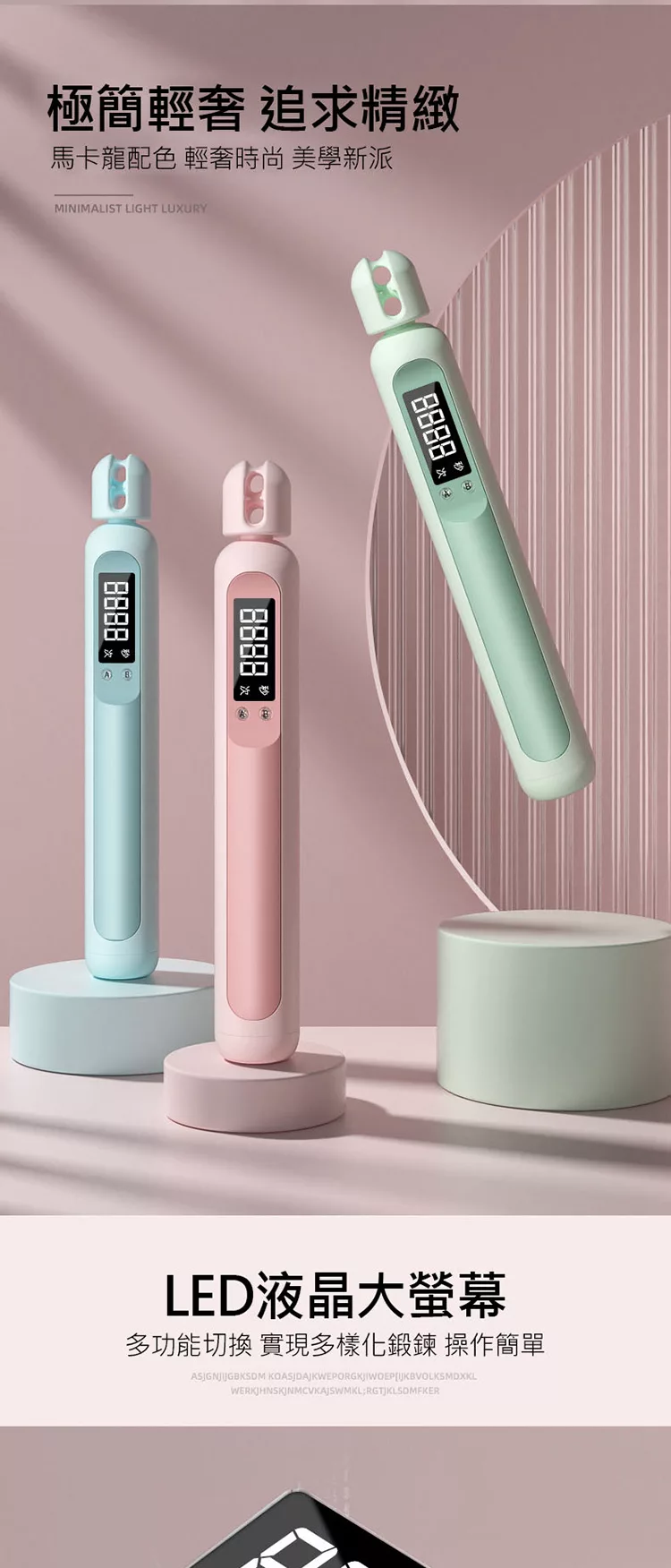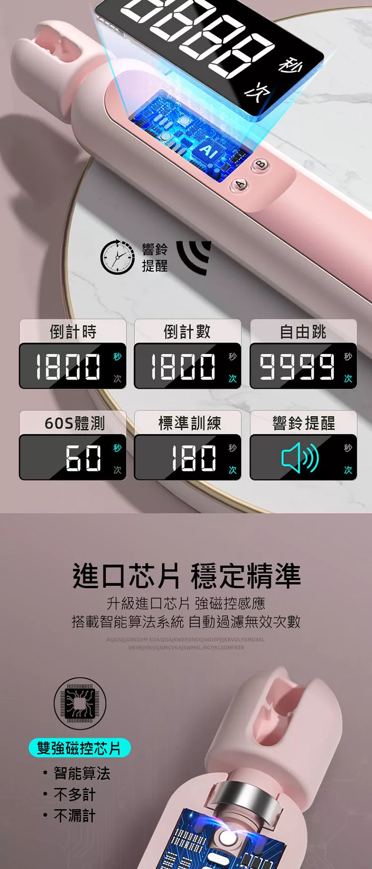 電子計數,LCD智能顯示一目了然,倒計時/倒計數/自由跳/響鈴提醒...多功能切換,實現多樣化鍛鍊、操作簡單。