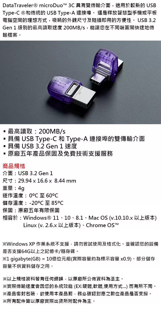 Kingston 金士頓 128GB DataTraveler Type-C USB3.2 隨身碟 DTDUO3CG3/128GB