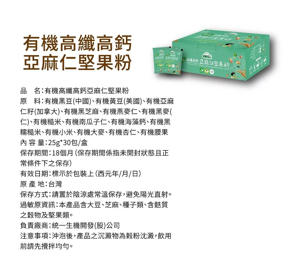 【統一生機】有機高纖高鈣亞麻仁堅果粉 (25g*30包/盒)