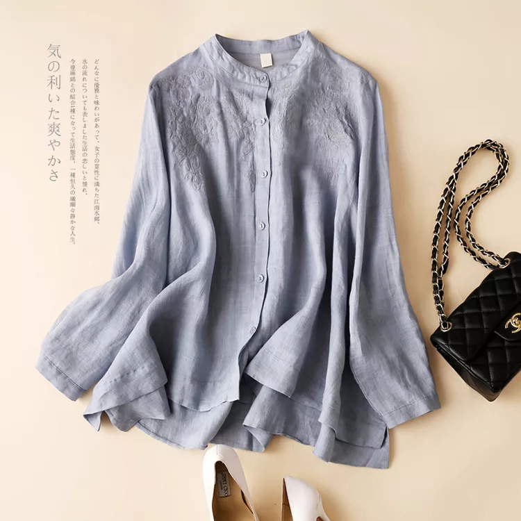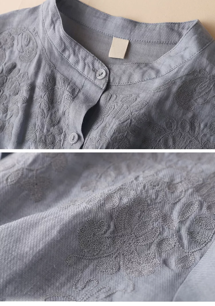 【慢。生活】復古文藝棉麻大碼寬鬆圓領刺繡襯衫 2202  FREE 藍色