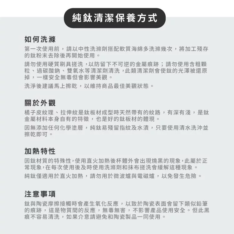 請勿使用含粗顆粒、過碳酸鈉、雙氧水等清潔劑清洗,此類清潔劑會使鈦的光澤被還原掉,一樣安全無毒但會影響美觀。