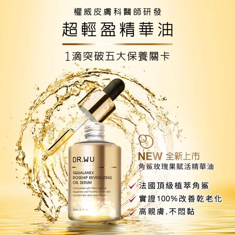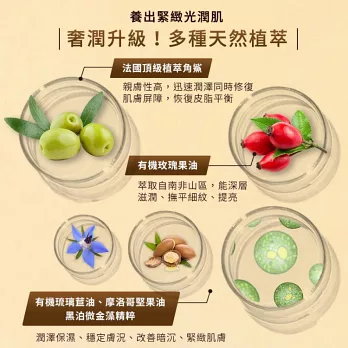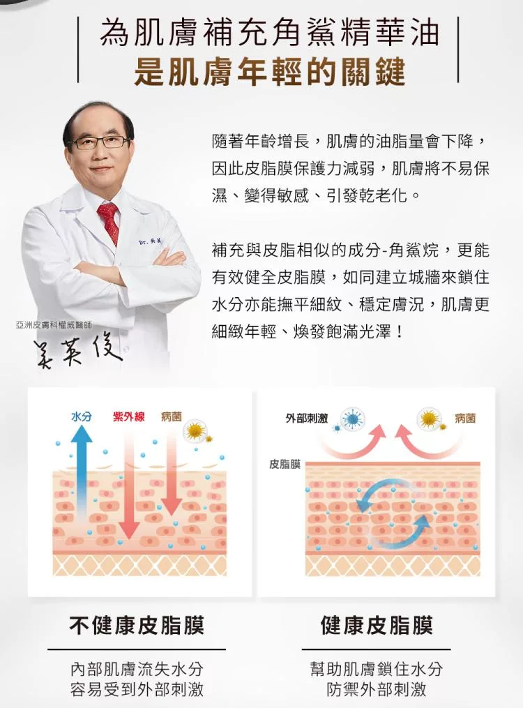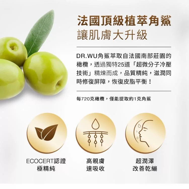 嚴選ECOCERT認證法國頂級植萃角鯊,萃取自法國南部莊園的橄欖,25度恆溫種植,手工親選,每720克橄欖,僅能提取約1克角鯊。透過25道「超微分子冷壓技術」,將油脂細緻化,使成分更精純,更以仿造肌膚原生脂質的高規格打造高親膚、超輕盈質地,能迅速滲透肌膚,不悶、不黏、不致痘。另添加3重珍奢精華油和1重珍稀藻精萃:源自南非山區的有機玫瑰果油,能深層滋潤、撫平細紋並提亮肌膚、液態黃金摩洛哥堅果油、英國有機琉璃苣油和法國黑泊微金藻精粹,僅僅一滴即能將蘊含其中的頂級成分能量發揮至極,能全面修復肌膚屏障,立即改善乾繃、細紋、粗糙,讓肌膚獲得全方位賦活與潤澤,重現柔嫩細緻光澤!