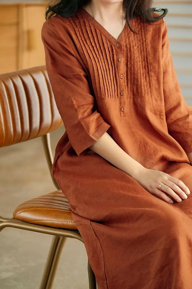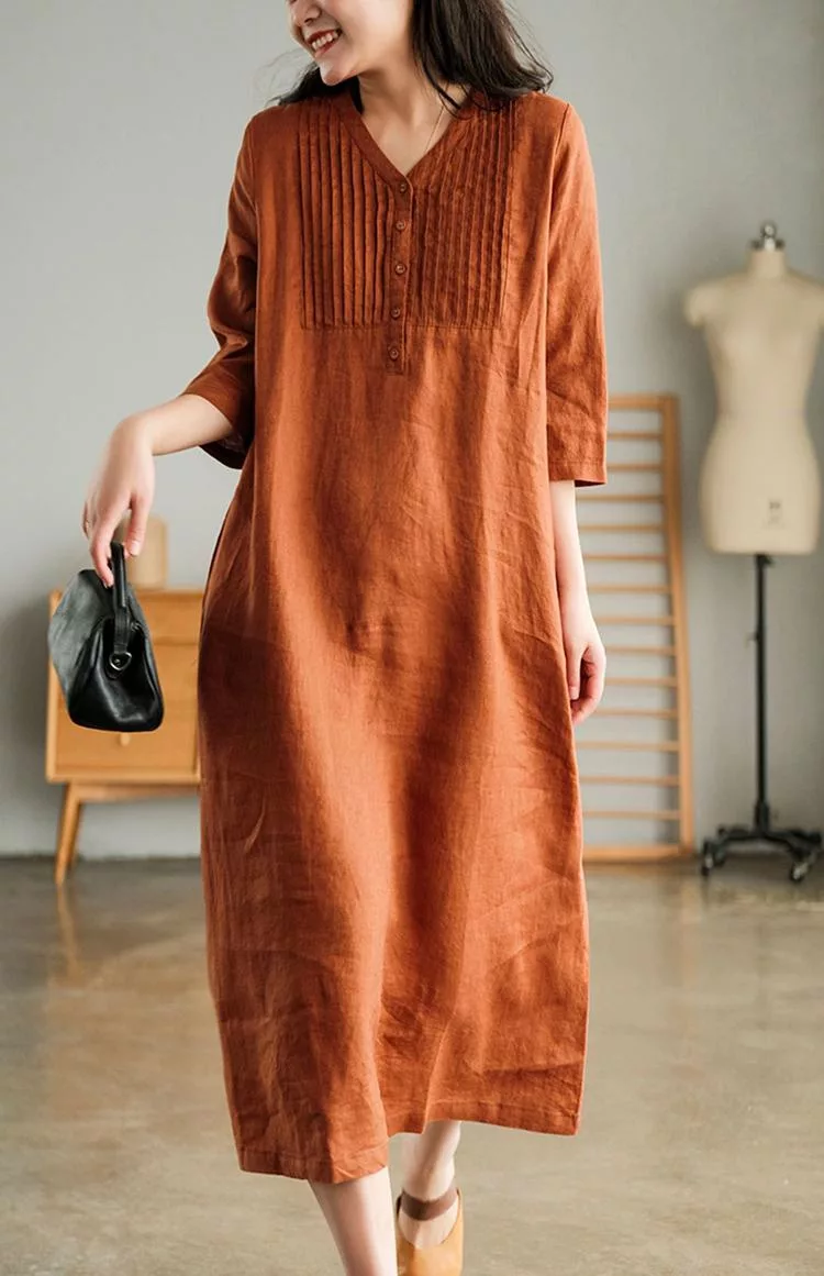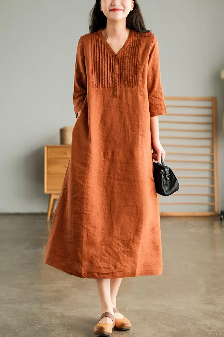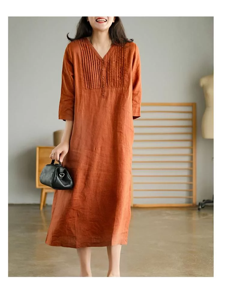 【慢。生活】春夏文藝亞麻感五分袖風琴褶V領連衣裙 9880 FREE 橘色