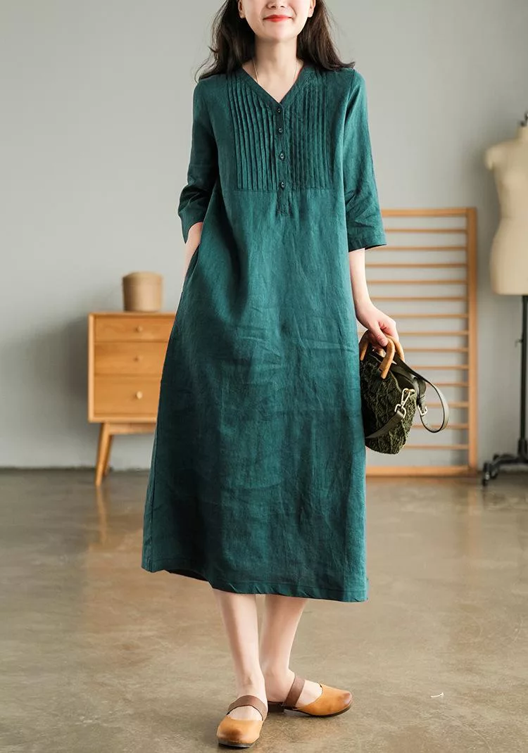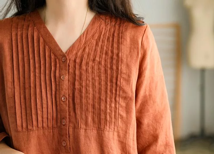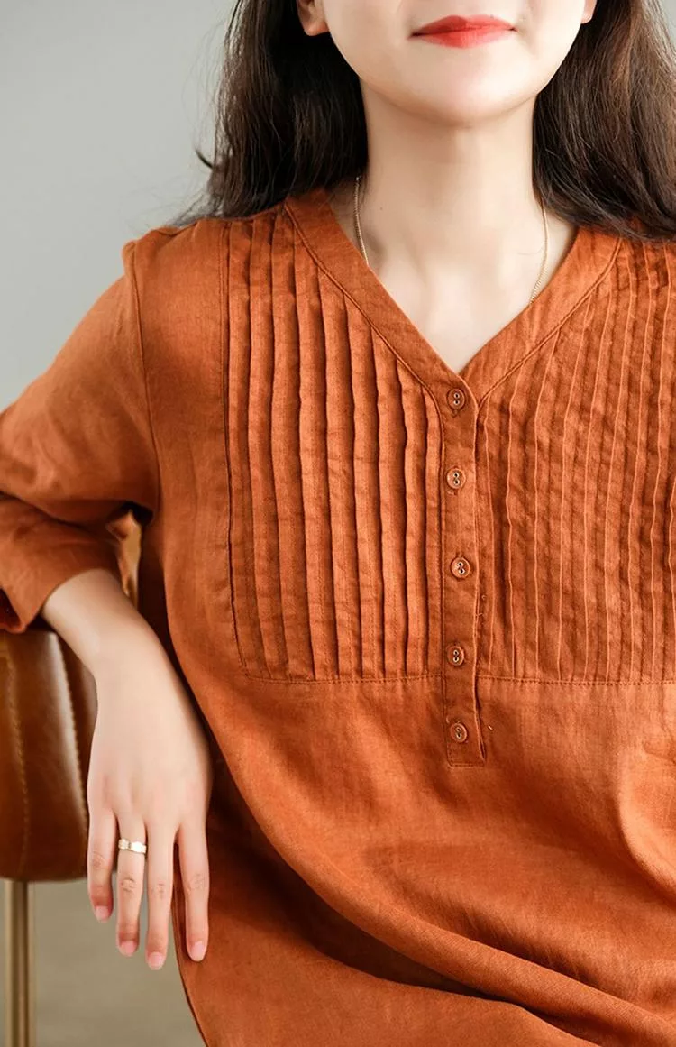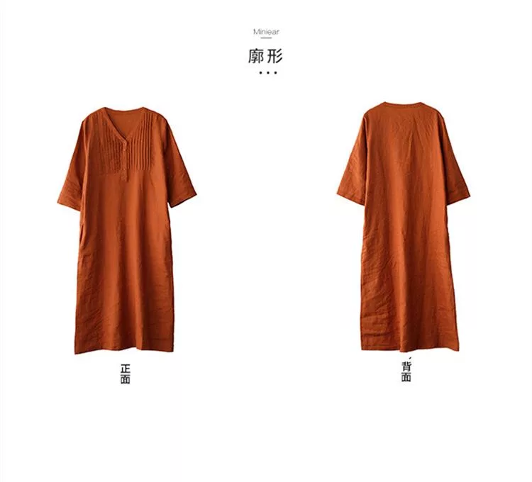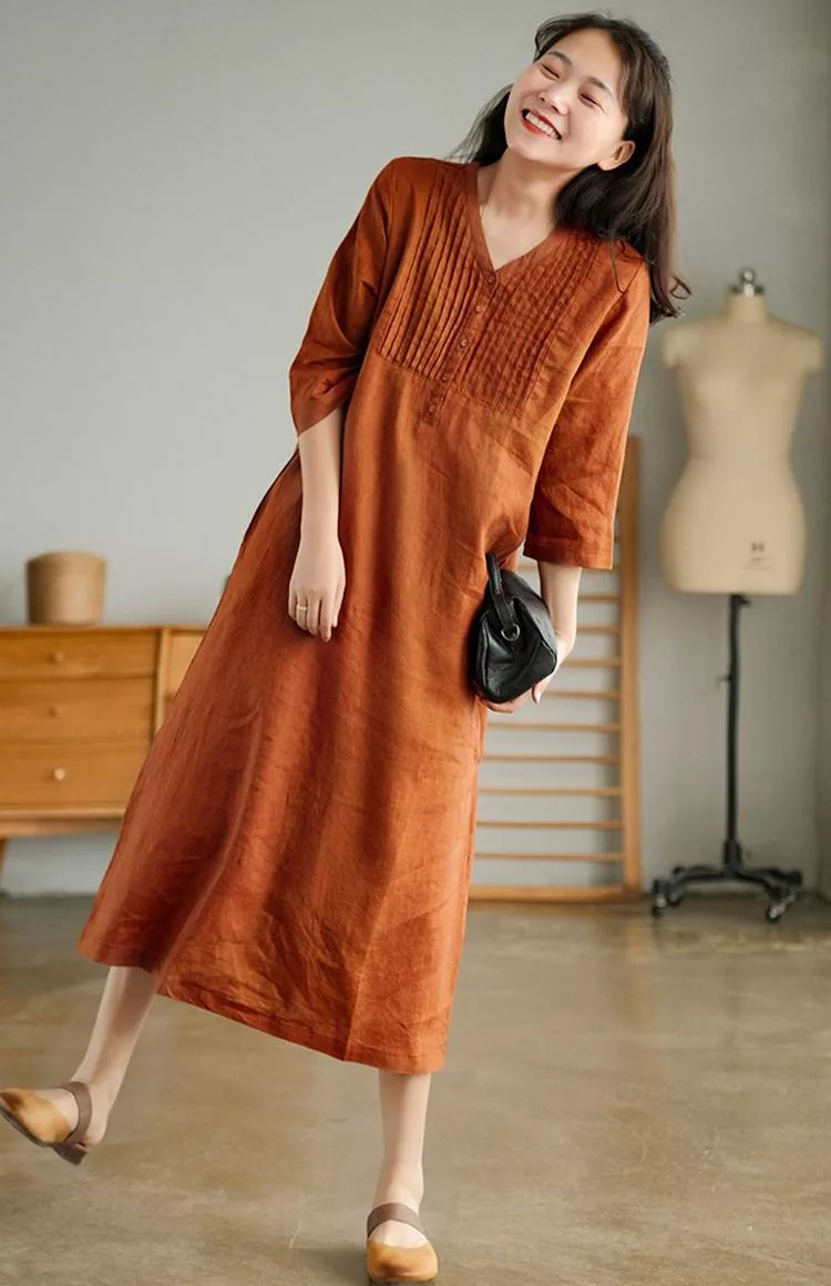 【慢。生活】春夏文藝亞麻感五分袖風琴褶V領連衣裙 9880  FREE 橘色