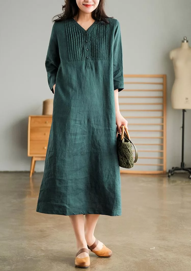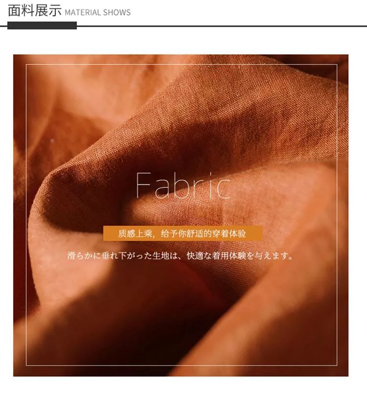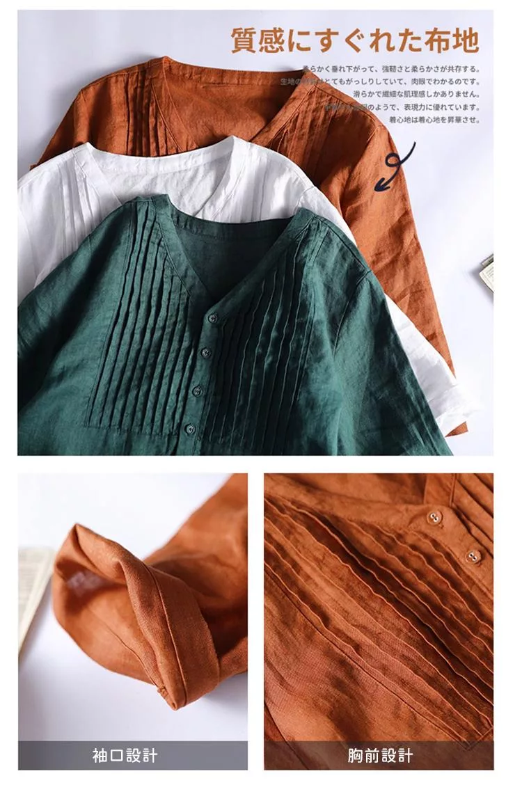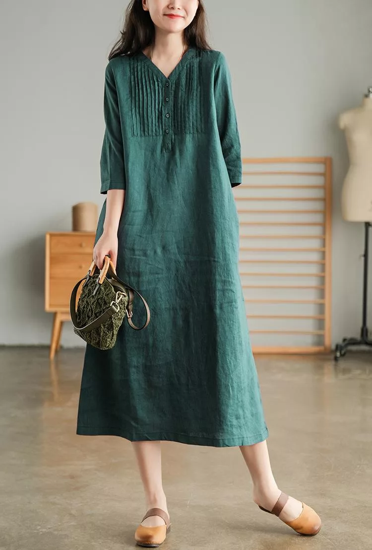 【慢。生活】春夏文藝亞麻感五分袖風琴褶V領連衣裙 9880  FREE 橘色