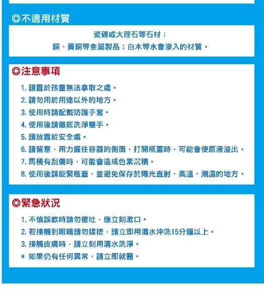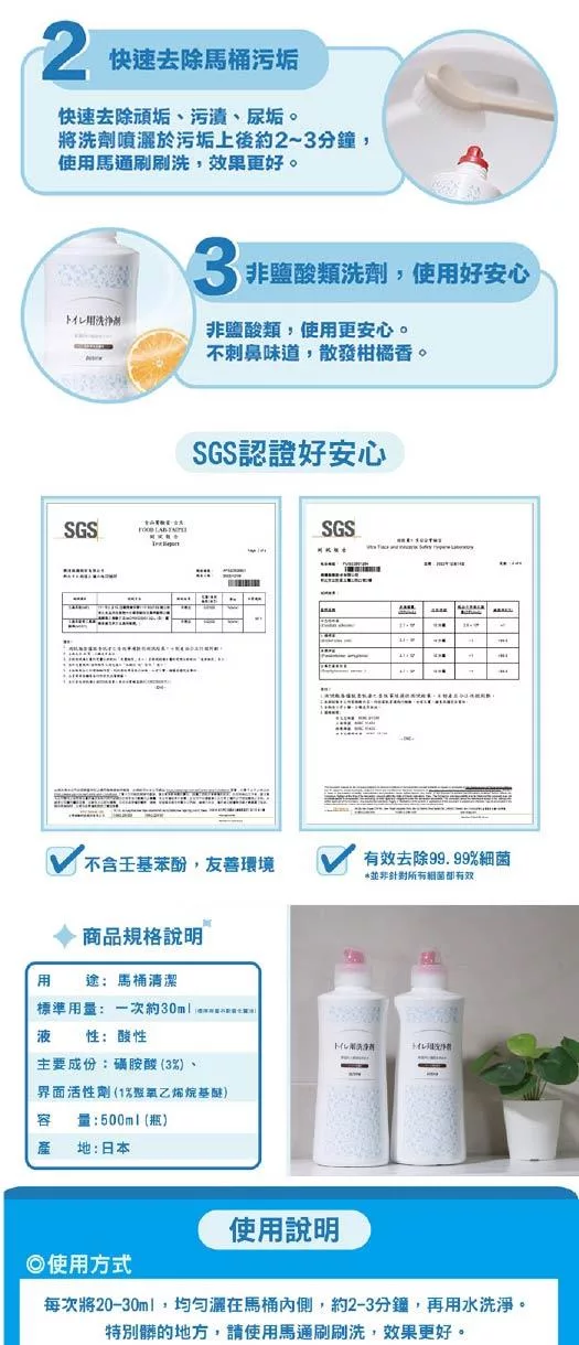 1.每次將20-30ml,均勻灑在馬桶內側,約2-3分鐘,再用水洗淨。