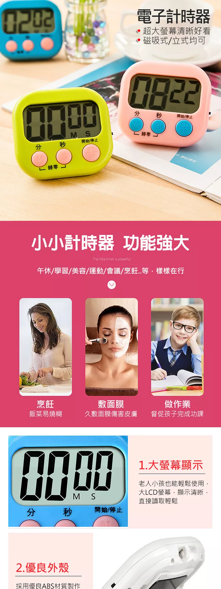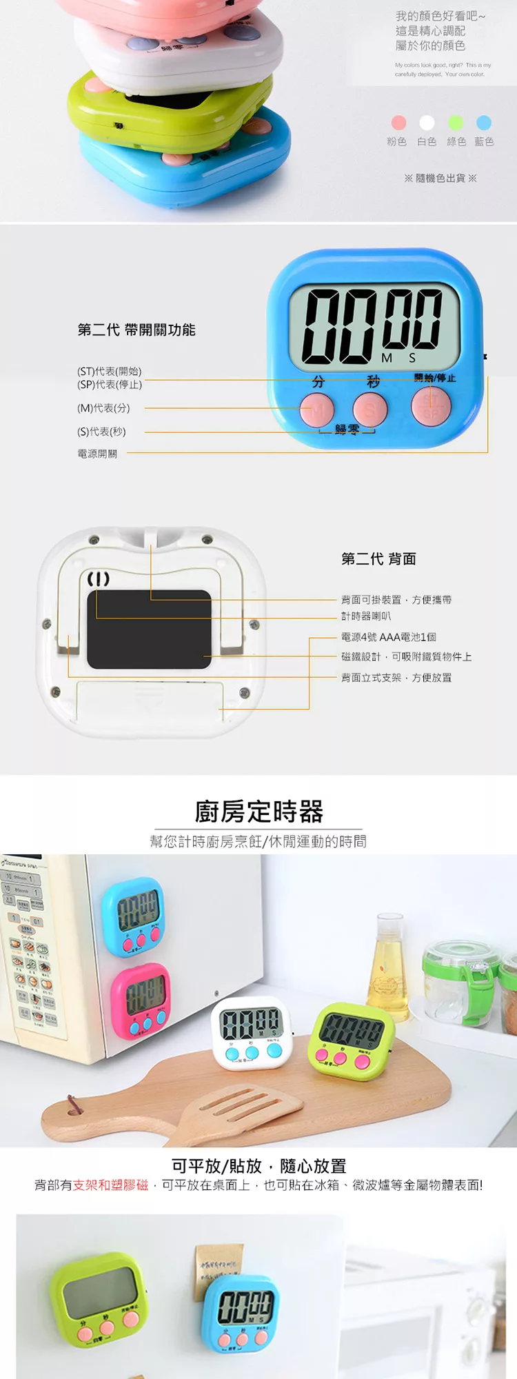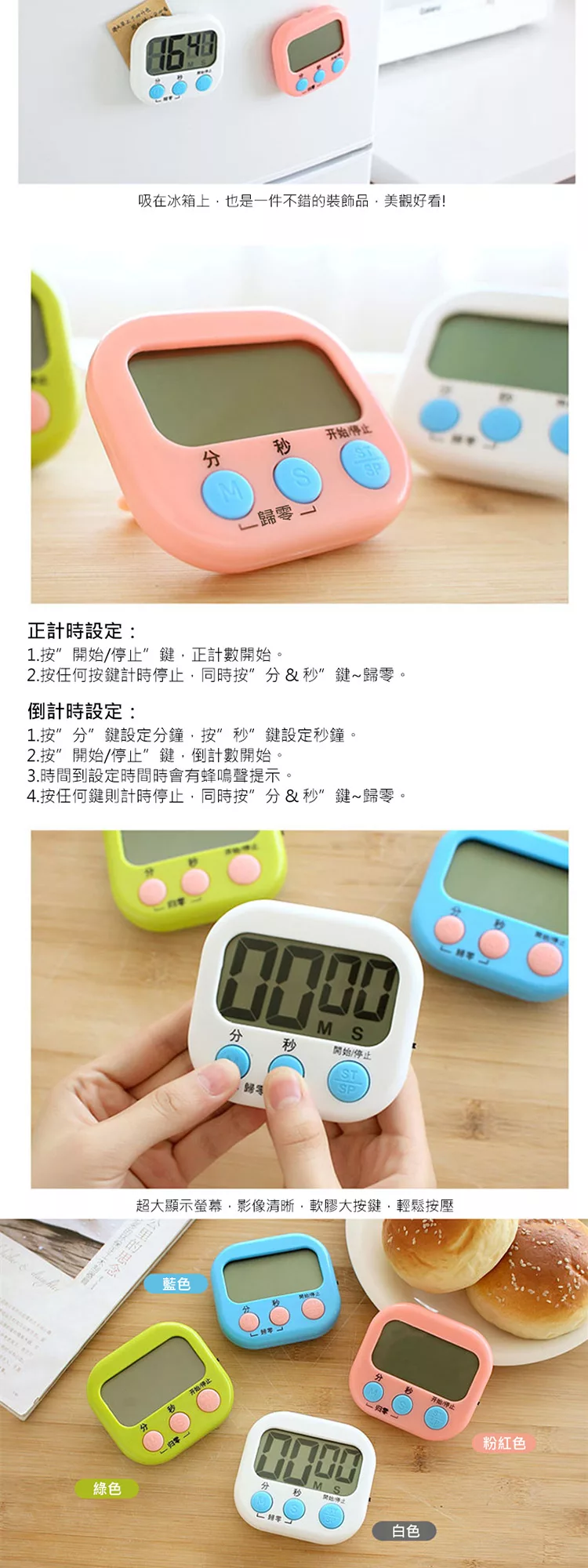 電子計時器 廚房定時器 正負倒數計時器 電子定時器 定時提醒器 大螢幕碼錶計時器 家用記時器 磁鐵吸附/可站立/吊掛 (顏色隨機)