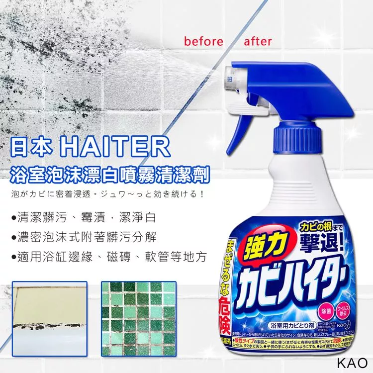 使用方式:使用前可佩戴手套(避免接觸清潔劑),朝向污垢處噴出泡沫,靜置5分鐘再用清水沖洗乾淨。若較深霉垢或髒汙,建議停留15~20分鐘後再洗淨效果較好。