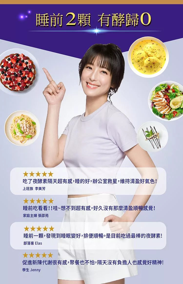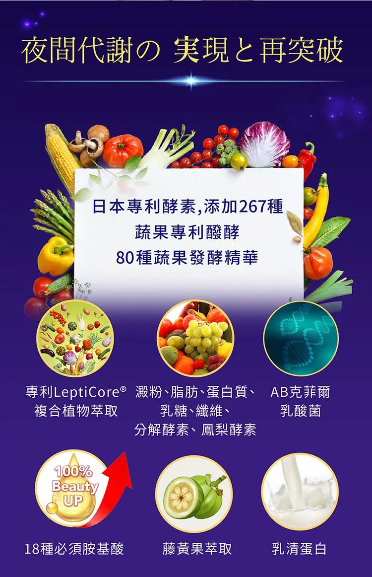 成 分:專利藤黃果萃取物、綜合必須胺基酸、牛乳清蛋白(乳清蛋白、大豆軟磷脂)、啤酒酵母、專利麩胺酸發酵物粉(含GABA)、L-色胺酸、綜合酵素:木瓜酵素(麥芽糊精、木瓜酵素、偏亞硫酸氫鈉)、蛋白酵素(麥芽糊精、蛋白酶、糊精)、乳糖分解酵素(麥芽糊精、乳糖酵素、磷酸氫鈣)、解脂酵素(麥芽糊精、糊精、脂解酵素)、澱粉分解酵素(麥芽糊精、澱粉分解酵素、糊精)、纖維分解酵素(麥芽糊精、乳糖、纖維水解酵素、大豆蛋白)、美國N.zimes®綜合消化酵素(澱粉酵素、葡萄糖澱粉酵素、植物酵素(含脂肪分解酵素、蛋白質分解酵素、澱粉酵素)、植酸酵素、果膠酵素、脂肪分解酵素、蛋白質酵素、轉化酵素、蛋白分解酵素 、鳳梨酵素、β-葡聚醣酵素、纖維分解酵素、蛋白分解酵素、半纖維素分解酵素、木聚醣酵素、乳糖酵素、木瓜酵素、胜肽酵素、蛋白分解酵素、澱粉糖化酵素、麥芽糊精)、鳳梨酵素(鳳梨莖萃取物、麥芽糊精)、日本專利53種植物醱酵粉(黑糖、果糖、葡萄糖、蘋果、柿子、香蕉、鳳梨、白米、糙米、糯米、栗、大麥、黍、玉米、蜜柑、八朔密柑、臍橙、伊予柑、檸檬、夏蜜柑、臭橙、金橘、文旦、椪柑、柚子、大豆、黑芝麻、白芝麻、黑豆、胡蘿蔔、大蒜、牛蒡、百合、蓮藕、葡萄、通草、無花果、木天蓼、山葡萄、楊梅、草莓、烏梅、羊栖菜、裙帶菜、海苔、青海苔、昆布、蜂蜜、核桃、澱粉、胡瓜、芹菜、紫蘇)、微結晶纖維素、專利PVF-207綜合蔬果酵素粉末(綜合蔬果酵素粉、麥芽糊精、抹茶粉、諾麗果濃縮發酵粉、大麥苗粉、小麥苗粉)、AB克菲爾乳酸菌(長雙歧桿菌Bifidobacterium longum、嗜酸乳桿菌Lactobacillus acidophilus、醱酵乳桿菌Lactobacillus fermentum、瑞士乳桿菌Lactobacillus helveticus、副乾酪乳桿菌Lactobacillus paracasei、鼠李糖乳桿菌Lactobacillus rhamnosus、嗜熱鏈球菌Streptococcus thermophilus、馬克思克魯維酵母菌Kluyveromyces marxianus)、L-肉酸(肉鹼)、酵母鉻、lepticore®專利複合式植物萃取(關華豆、刺槐豆、阿拉伯膠、東絲藻、β-胡蘿蔔素、石榴萃取)、副乾酪乳桿菌(日本專利Lactobacillus paracasei K-2)(Plant Origin Lactic Acid Bacteria K-2)、羊角豆萃取物、硬脂酸鎂、二氧化矽、水性膜衣(羥丙基甲基纖維素、麥芽糊精、葡萄糖、大豆卵磷脂、檸檬酸鈉。