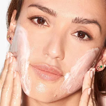 接著用溫水洗淨,產品質地會從凝膠轉化至乳狀,可徹底溶解彩妝髒污。