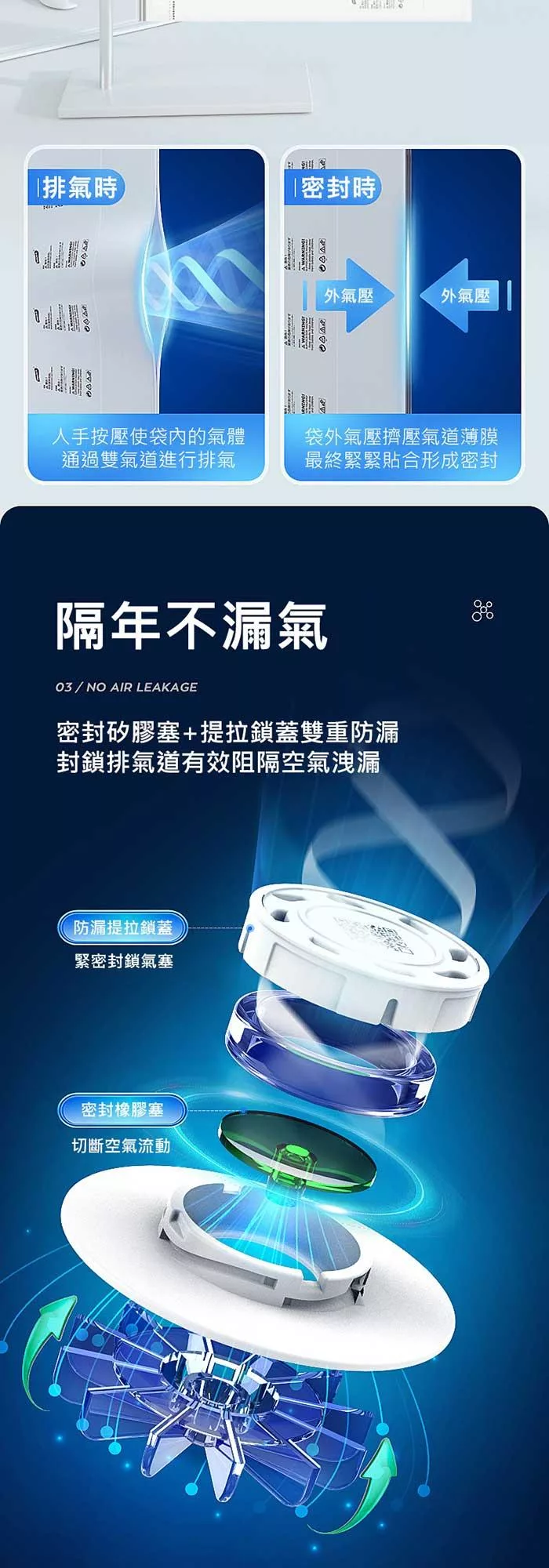 氣閥/氣道雙排氣設計,免抽氣,按壓更快排氣