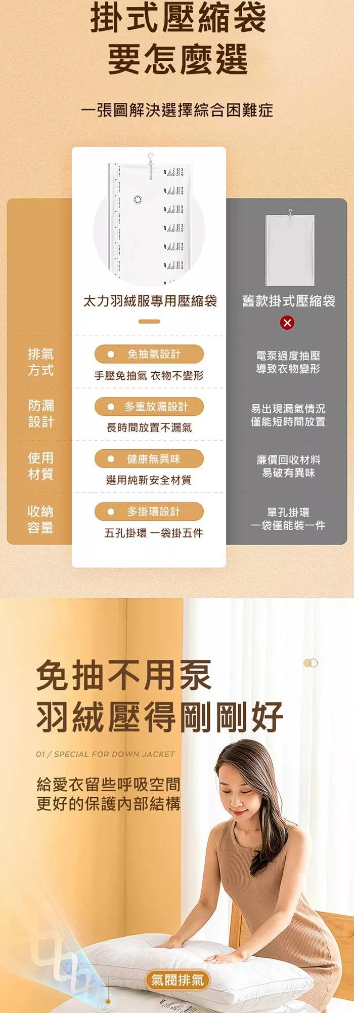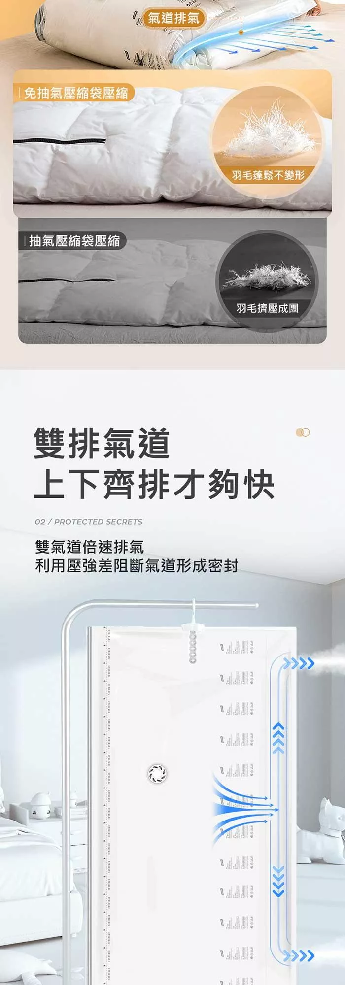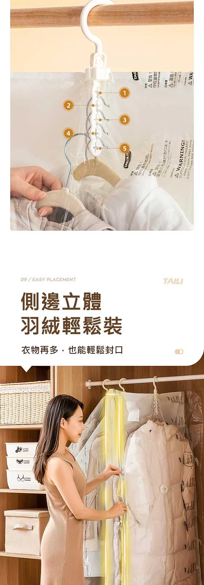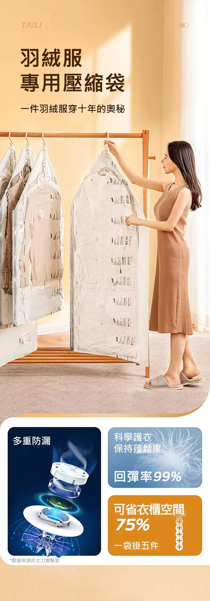 側邊立體式設計,羽絨大衣輕鬆裝,可同時收納5件,壓縮空間達75%,使用更方便