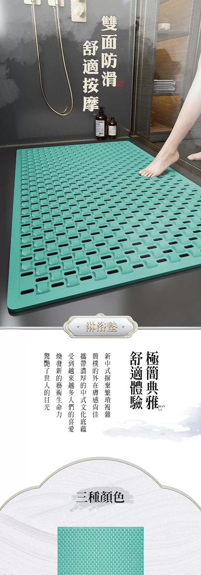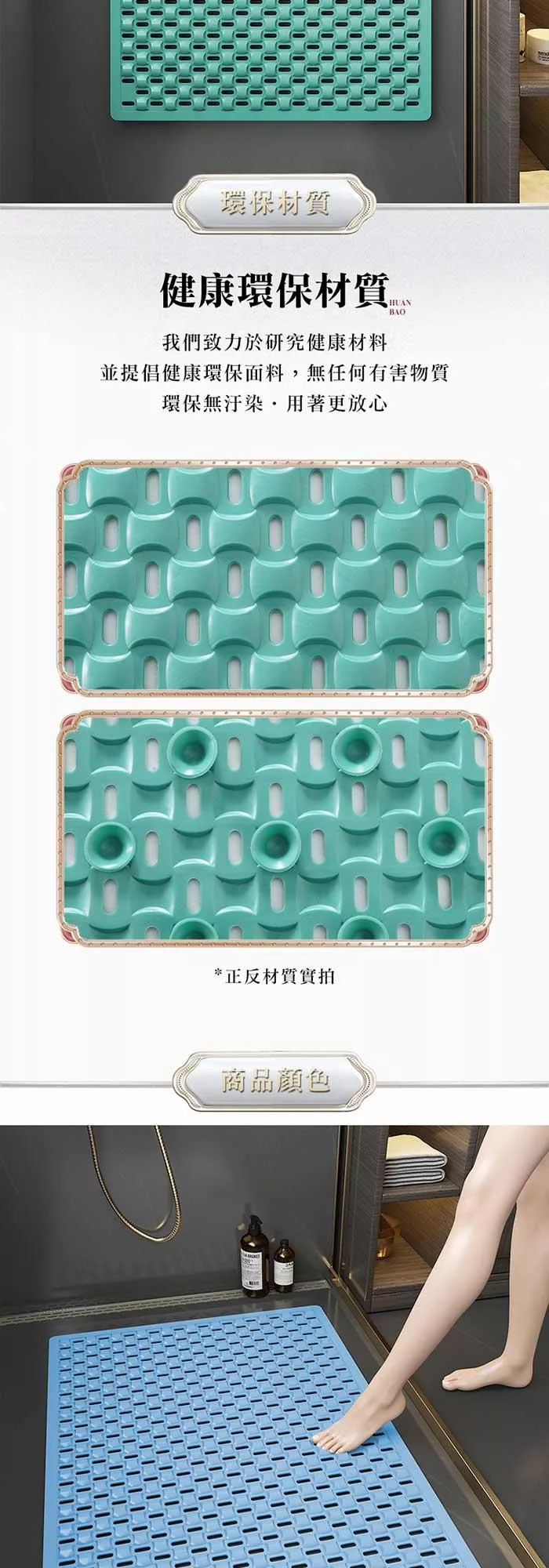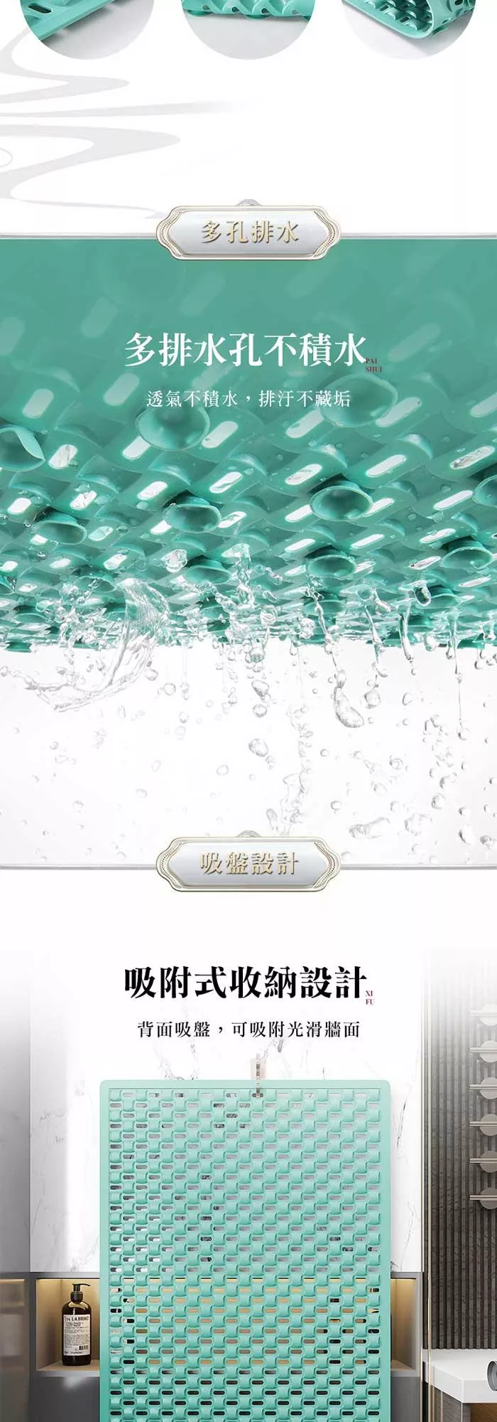 環保無味,強力吸盤,雙面防滑,多孔設計,加速排水!